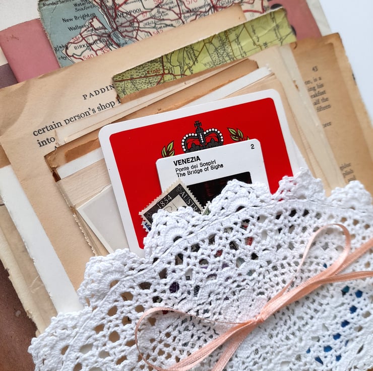 The pack consists of music scores, dictionary pages, sewing pattern piece, knitting pattern, pages from children's and reference books, map pieces, etc. All neatly tied with a ribbon and adorned with a doily. Fabulous for junk journaling, art collages, mixed media projects and scrapbooking.