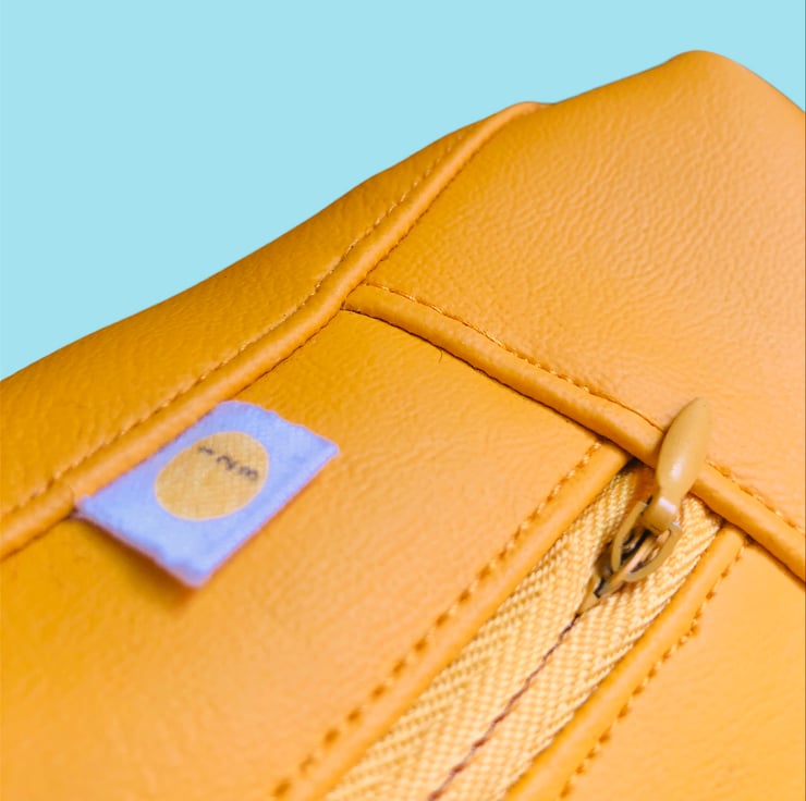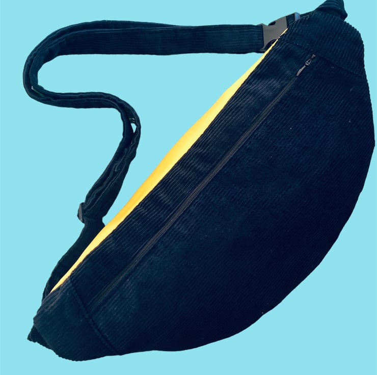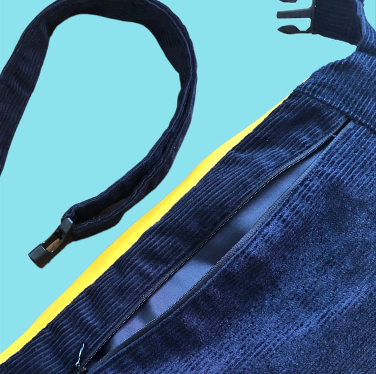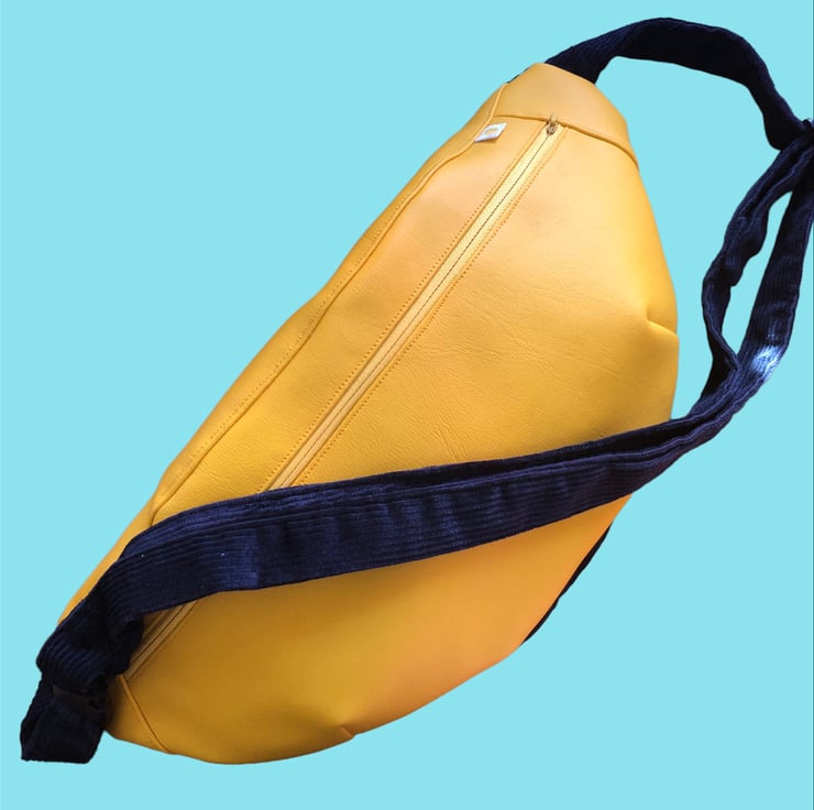 This piece is made out of yellow vegan leather with a yellow zipper at the front and navy corduroy with a black zip at the back.