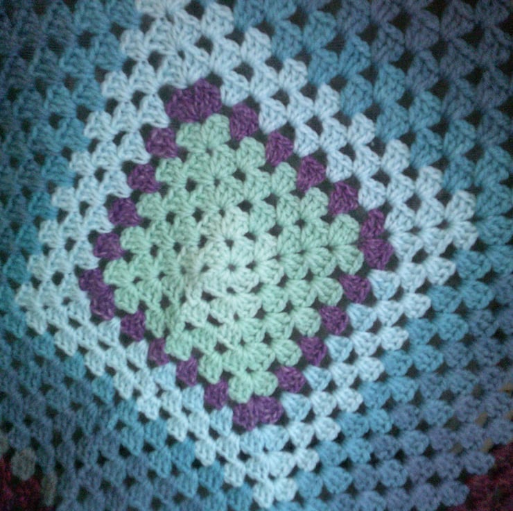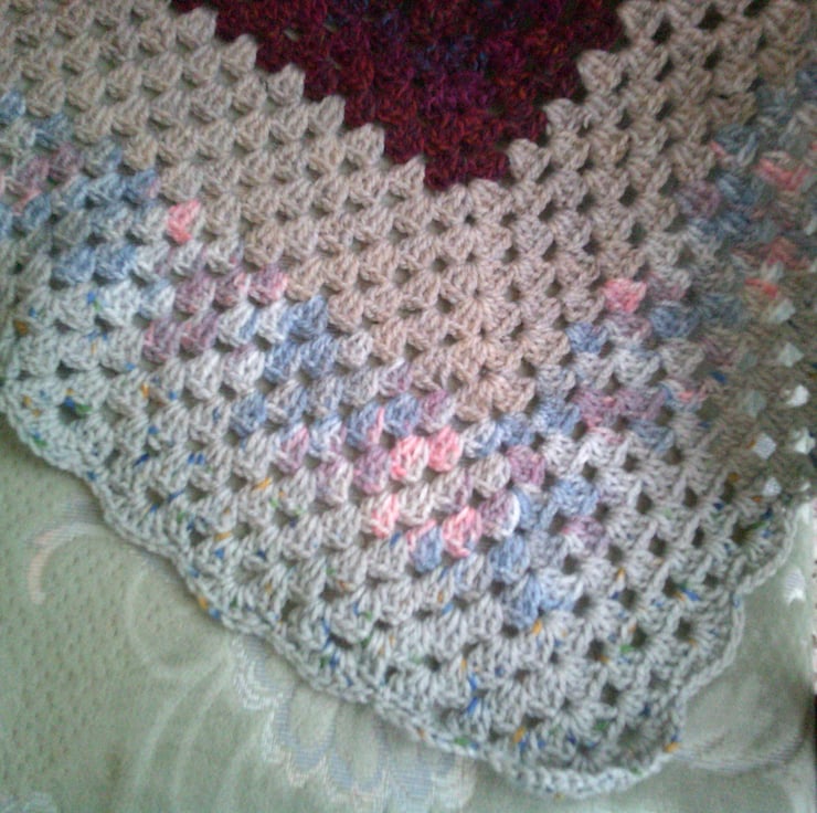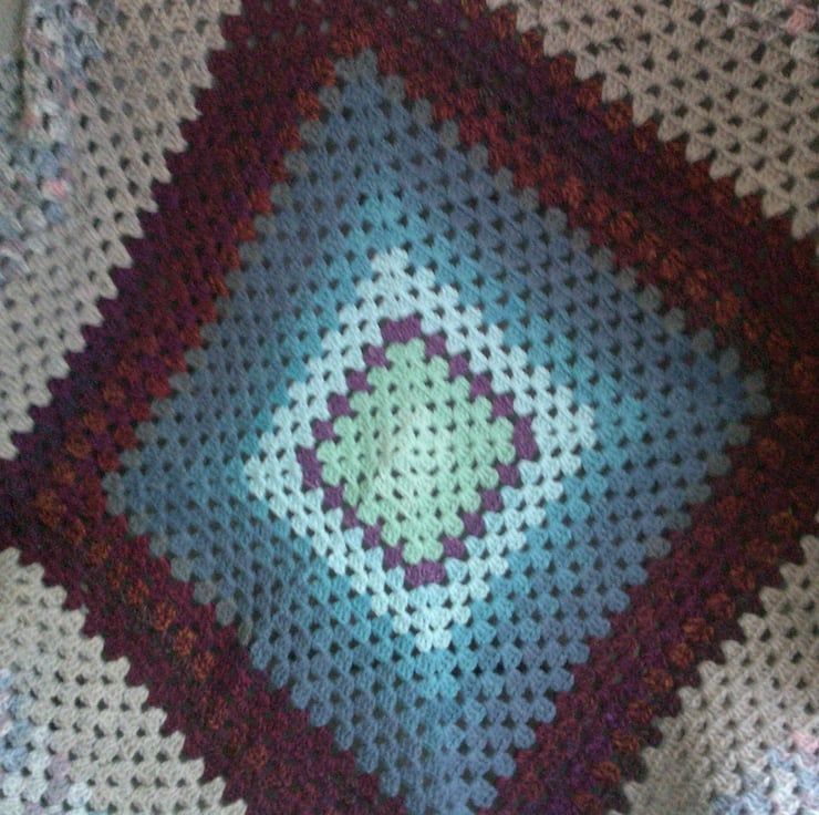 This vintage style crocheted lap blanket measures approximately 36 inches (91.5cm) square. It is made as a large "Granny" square with a scalloped edge in green, blue, grey, burgundy and turquoise.