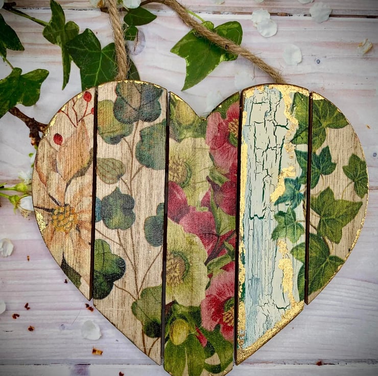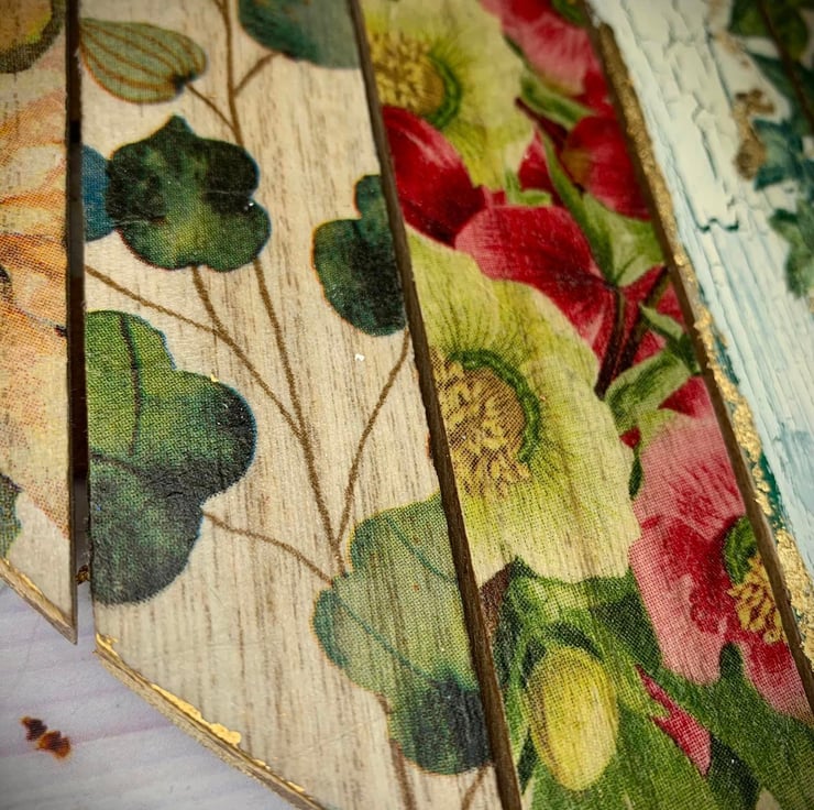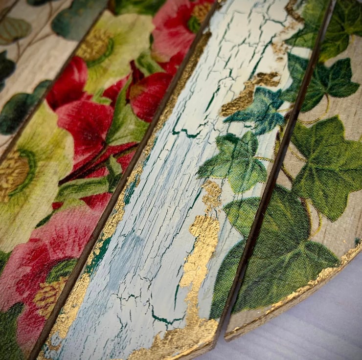 I've used napkin decoupage, crackled paint effects and foil leaf to create this unique floral wall hanging. The base is made of MDF with a Paulownia wood grain appearance, which can be seen through the decoupage design.