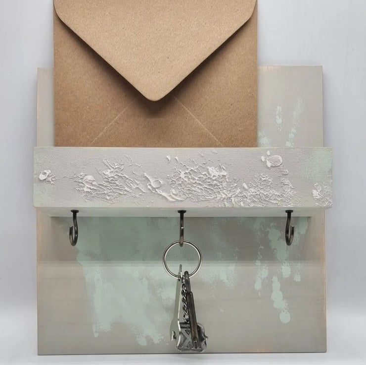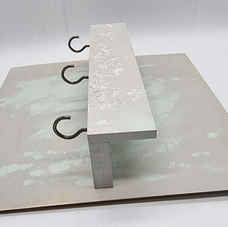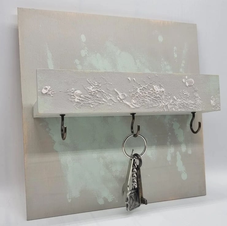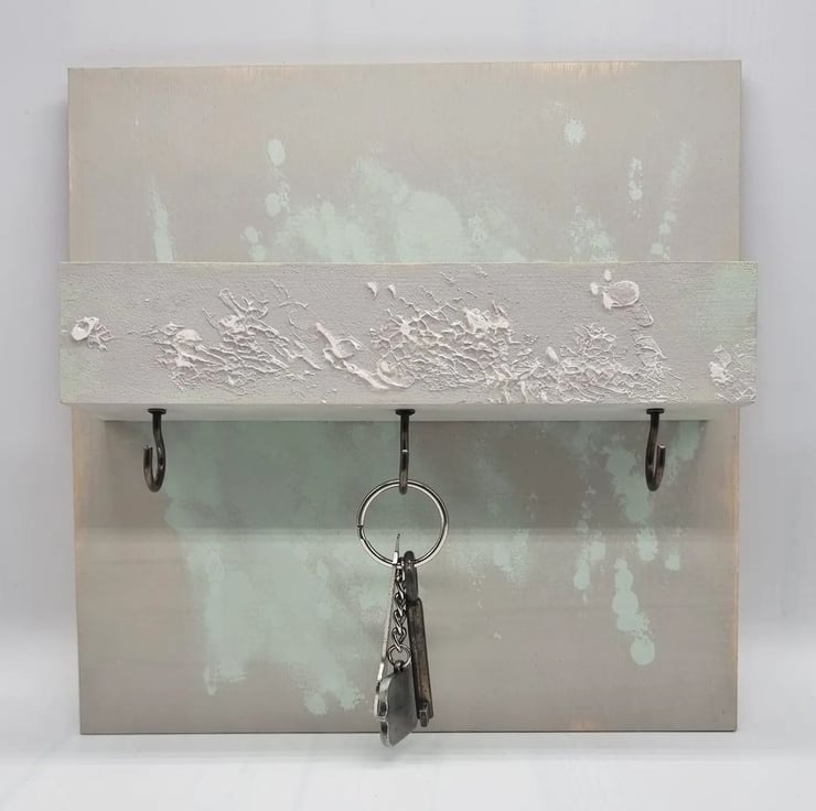 Used materials: plywood, Dulux (perfectly taupe & willow tree), texture paste, brass metal screw in hooks, screws, hanger fasteners, sander, wax finish varnish.