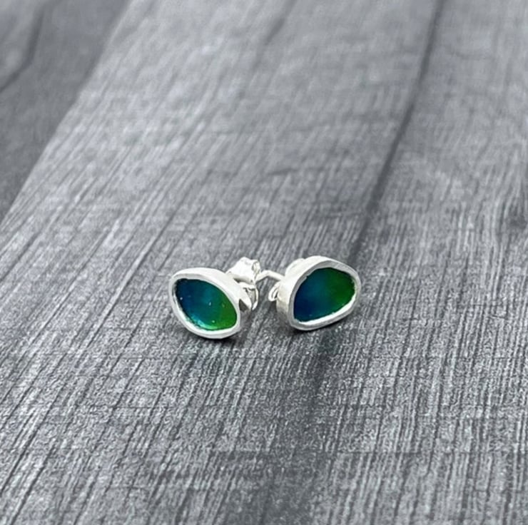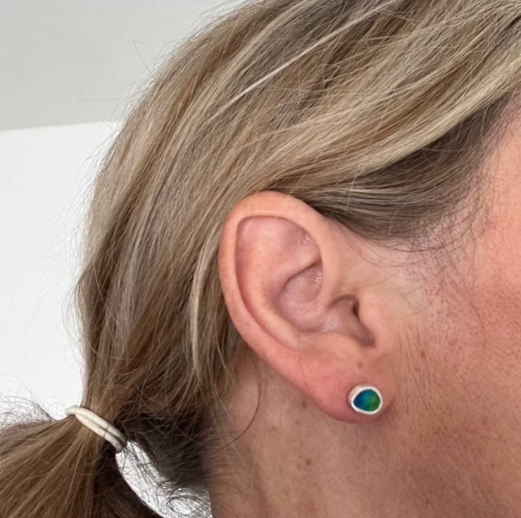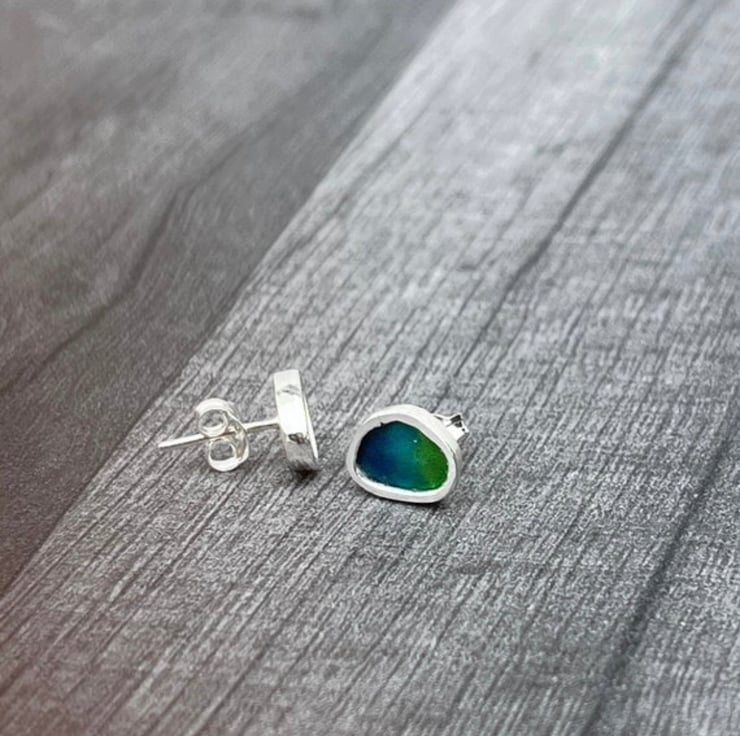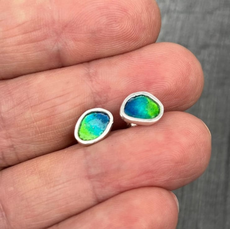 These peacock coloured enamel studs really stand out. They have a silver border and within, there are three different green enamels. They measure approx: 6 x 8 mm in size and have Sterling Silver posts and backs.
