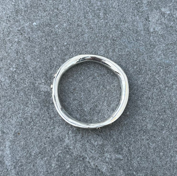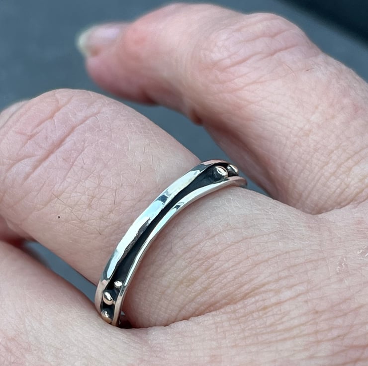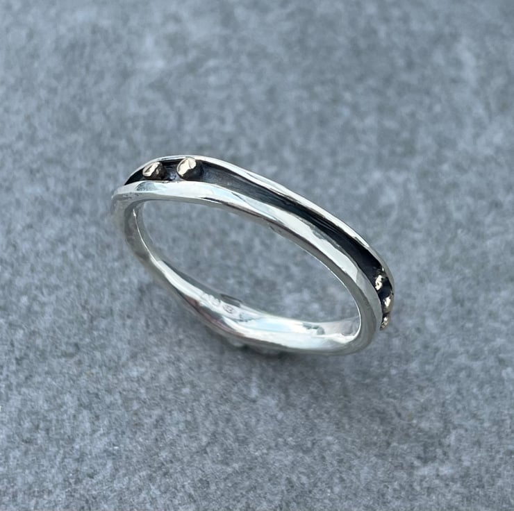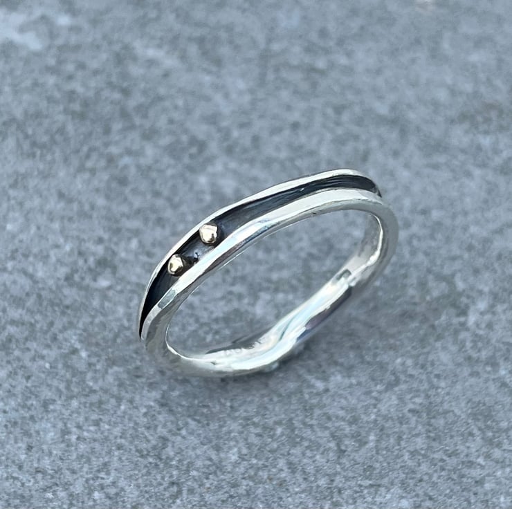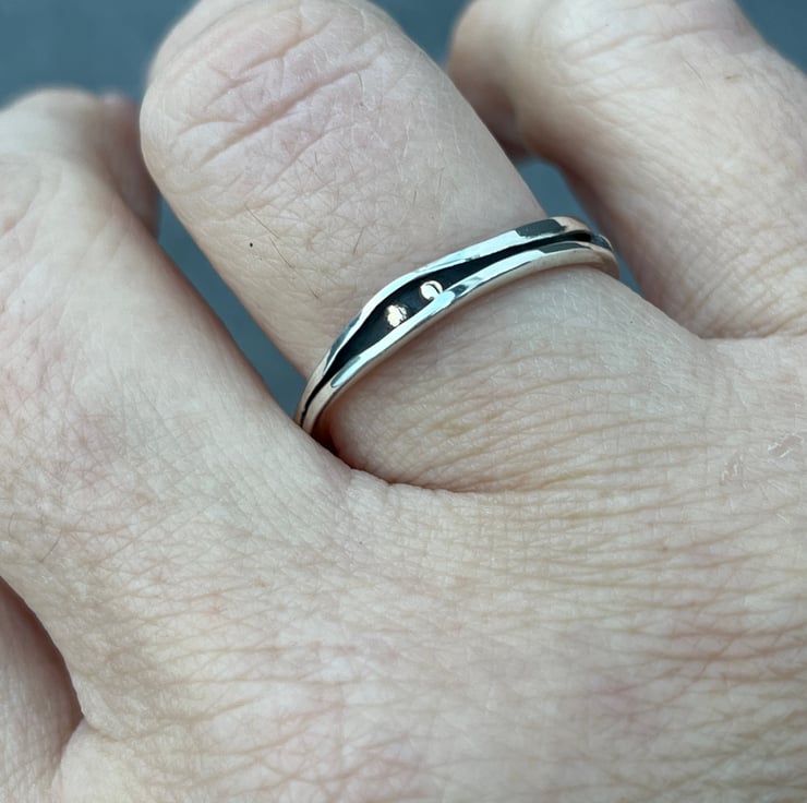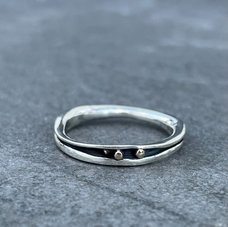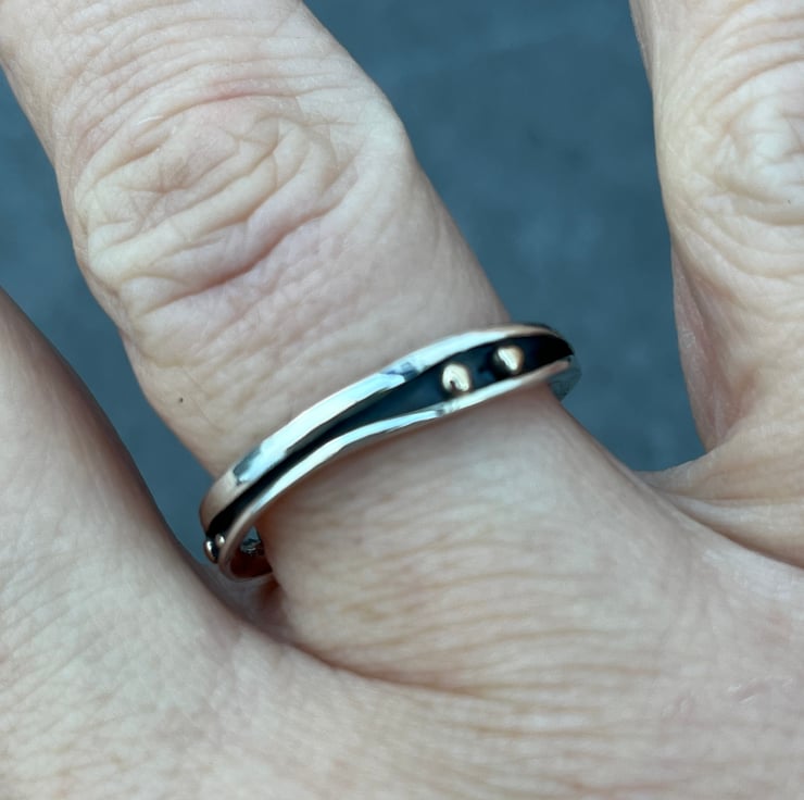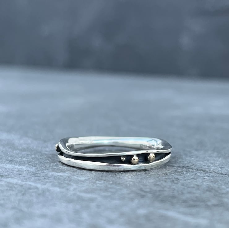 This Sterling Silver and 9ct gold, freeform ring sits comfortably on the finger. The wavy form features oxidation on the inside which contrasts beautifully with the 9ct gold bubble detail. The diameter at its widest measures approx: 5mm wide but varies.