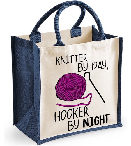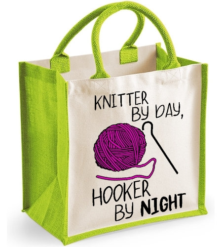 Knitter By Day Hooker By Night Midi Jute Shopper Canvas Lunch Bag Funny Wool