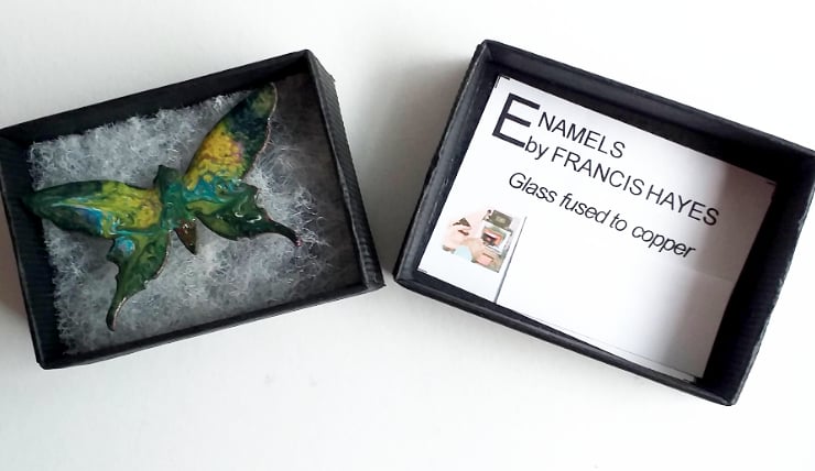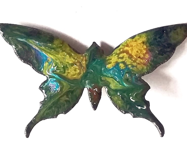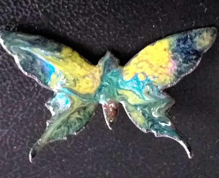 The majority of my work involves using the malleability of the glass enamel to decorate the copper blanks I use. The results are wholly unpredictable. Sooner or later the enamel will cool to a point at which I can no longer manipulate it, leaving me with a pattern of swirls and textures determined by the material. The butterfly shape lends itself particularly to this technique. The final result is a compromise between my aspirations and the impracticability of reworking the piece. Few pieces are lost entirely. There are many more possibilities lurking in the kiln.