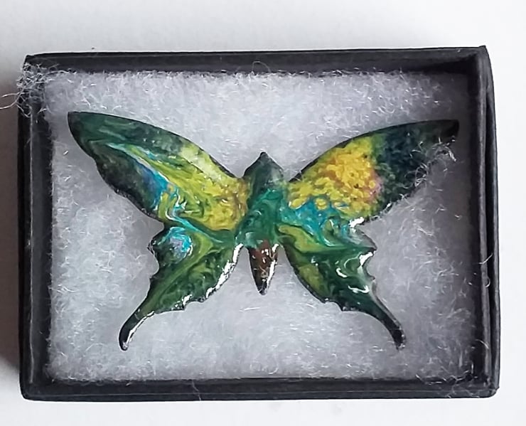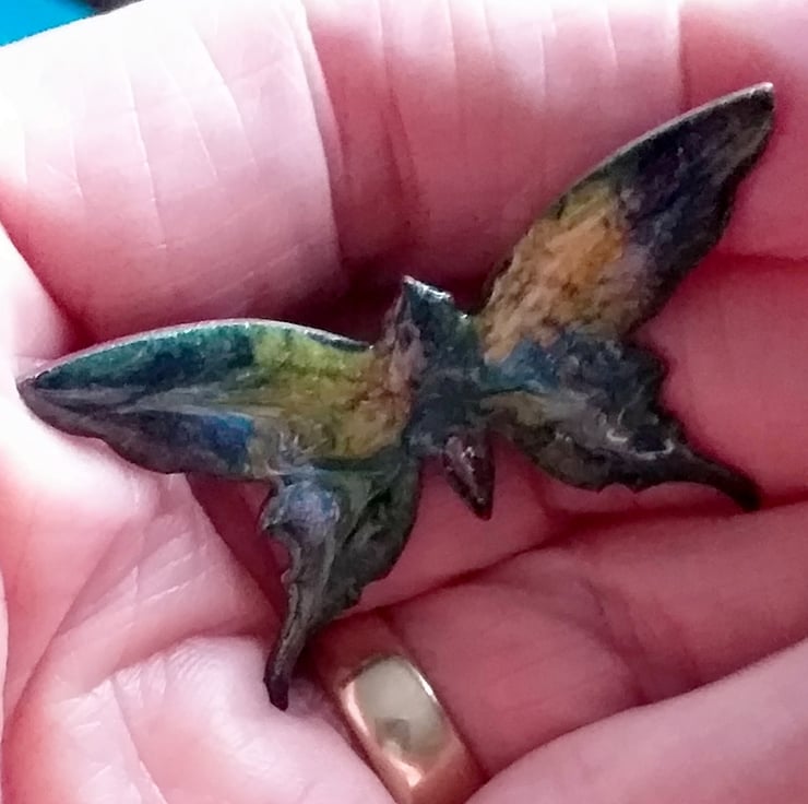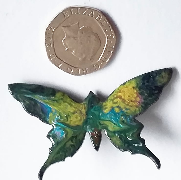 The butterfly measures 48mm from tip to tip of its upper wings, 28mm from the tip of the upper wings to the tip of the lower pair. I have soldered a 20mm brooch bar to the reverse of the butterfly. The brooch pin secures with a rotating catch.