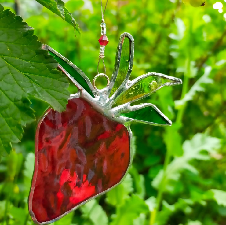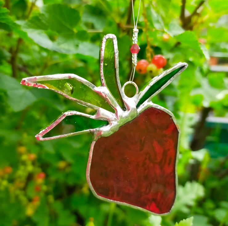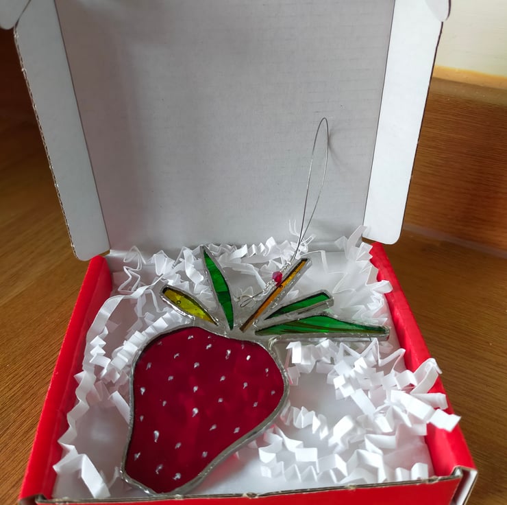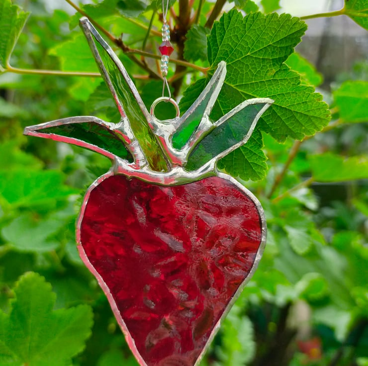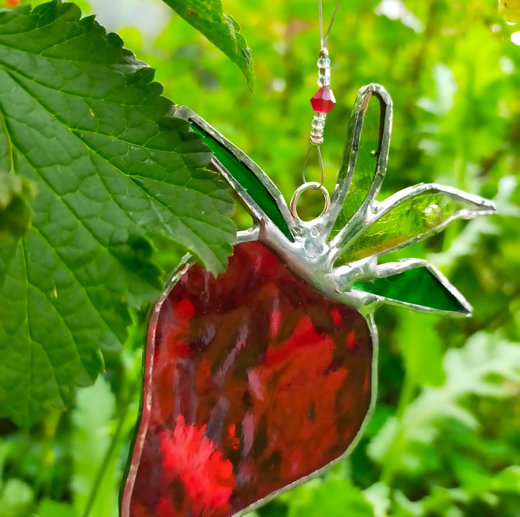 A pretty summer strawberry decoration handmade in red textured glass and a variety of green and gold glass for the leaves and stalk, no two are the same.