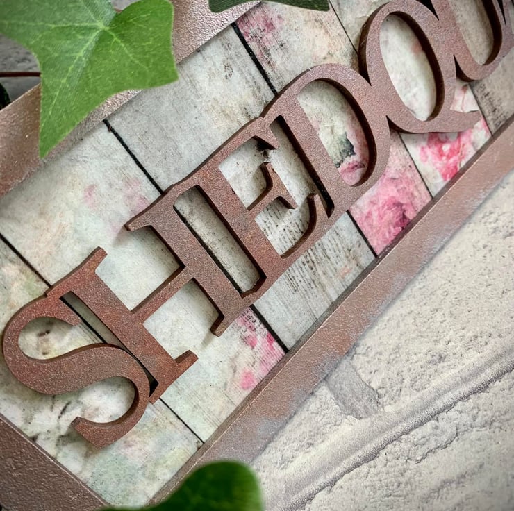 I've given this sign a feminine, floral feel, using a decorative rose and panel design rice paper for the decoupage background, and then a mix of silver, champagne and copper paint to give the lettering and borders an aged, metallic effect.