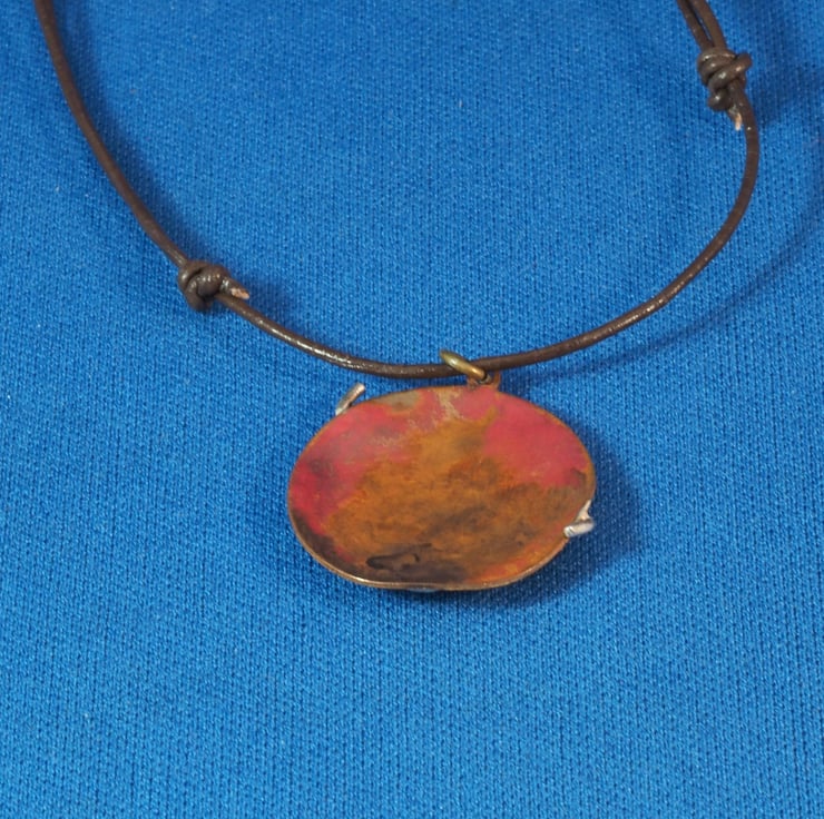 The silver on this occasion has taken on a granulated appearance, I'm guessing that it was harder to melt two pieces of wire successfully so close to each other. I made this a little while ago and don't remember exactly. It's quite a nice effect almost like foam on a wave.The pendant measures 2.5cm/1" across and hangs, by a copper jumpring through the tab at the top, from a narrow black leather thong. The thong can be adjusted for length from choker to mid chest.