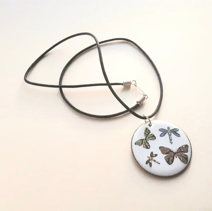 A circular pendant enamelled in white with colourful butterflies and dragonflies. It measures approximately 37mm in diameter. The reverse is also enamelled, in a mixed colour. The pendant hangs from 45cm black cord with a silver-plated fastener. It will be supplied in a quality gift packaging and sent by Royal Mail ‘signed for’ postage.