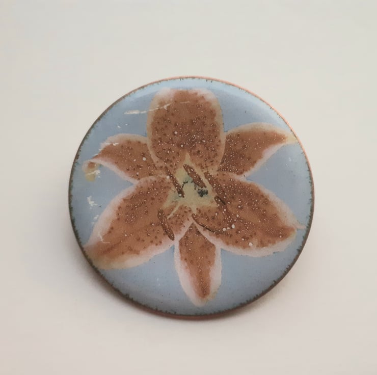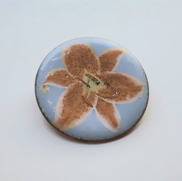A circular brooch enamelled in pale blue with a contrasting orange clematis flowerhead. It measures approximately 37mm in diameter and has a silver plated brooch fastener. The brooch is also enamelled on the reverse in a mixed colour. It is supplied in a quality gift packaging and sent by Royal Mail ‘