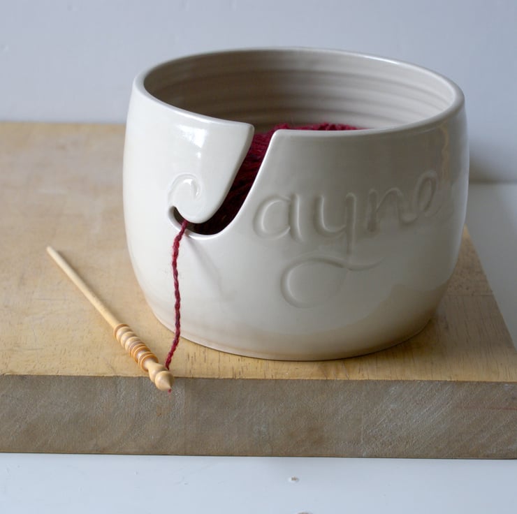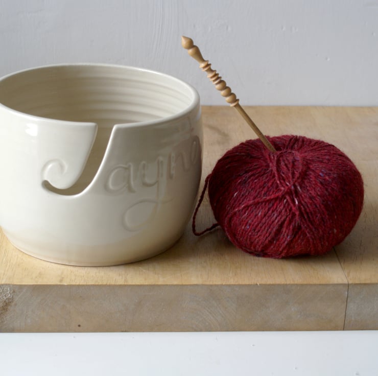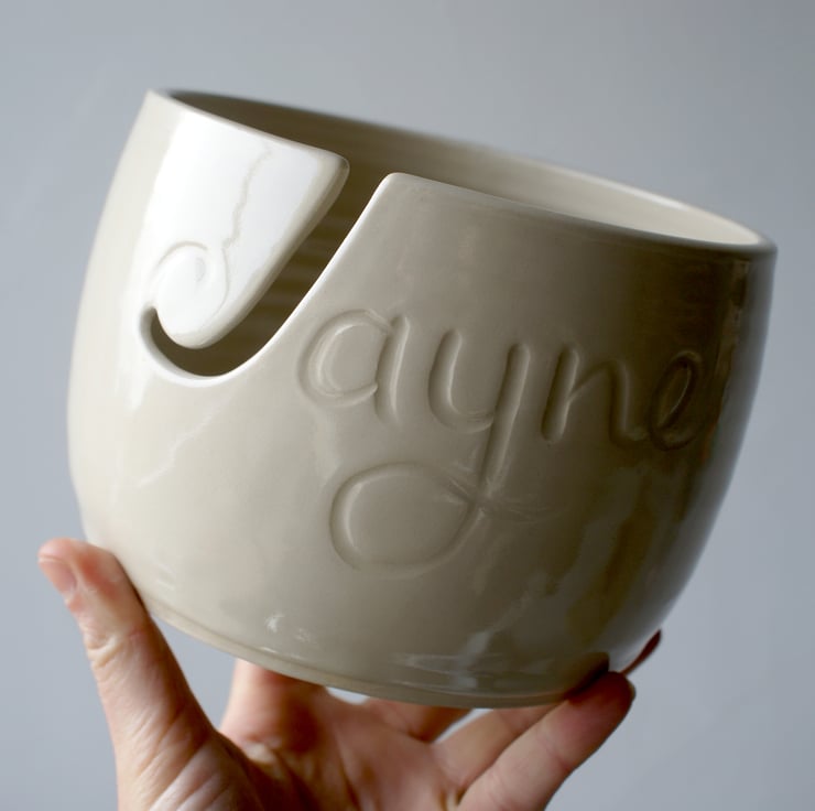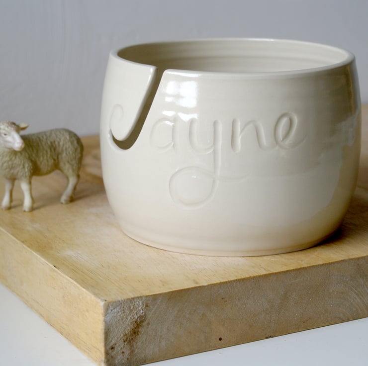 This named yarn bowl features the name 'Jayne' carved into the front making an ideal personalised gift. The inside of the J has been cut out to be the hook for the yarn to loop into when knitting. It's been glazed simply in a transparent glaze but you can still see the name underneath as it catches the light.