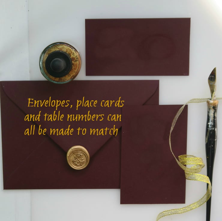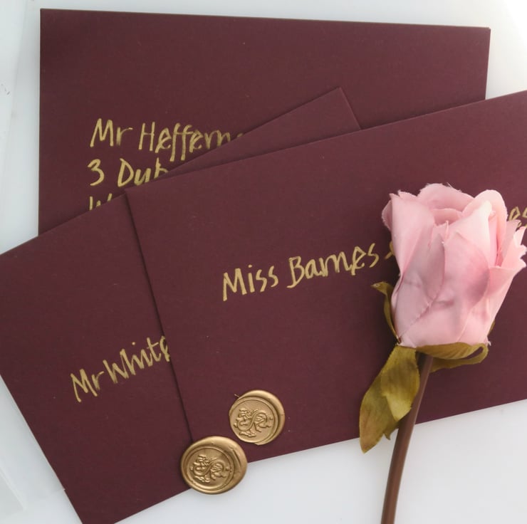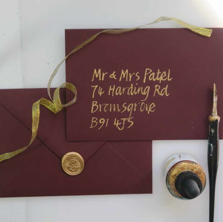 This listing is for an A6 ruby envelope with a calligraphy address in gold ink. The price includes a wax seal that can be fixed to the back after the message, invite, or card is put into the envelope.