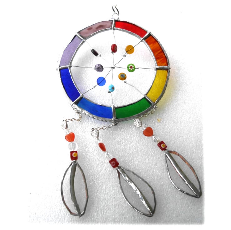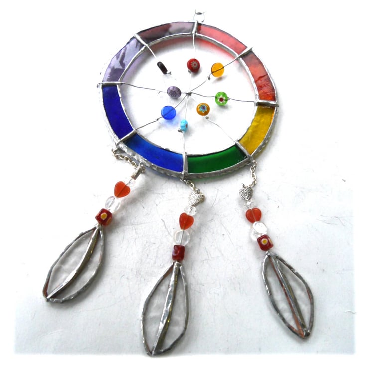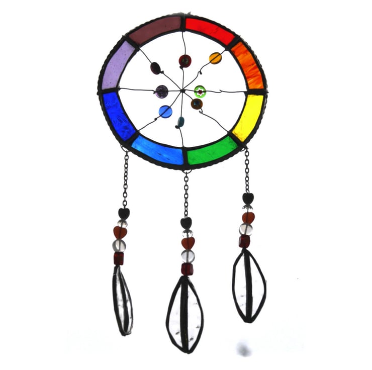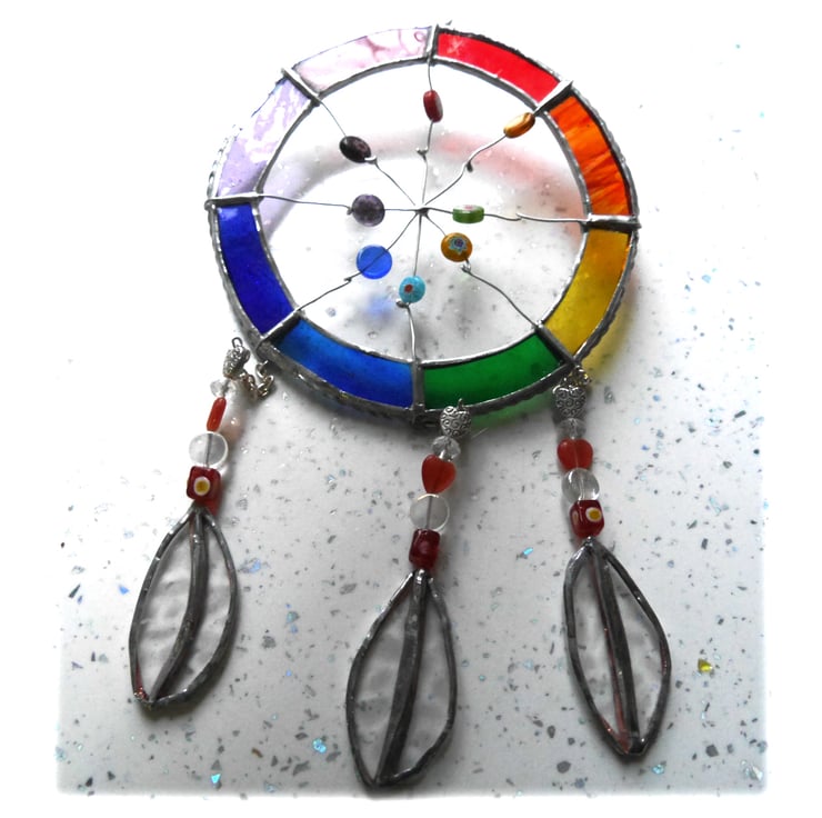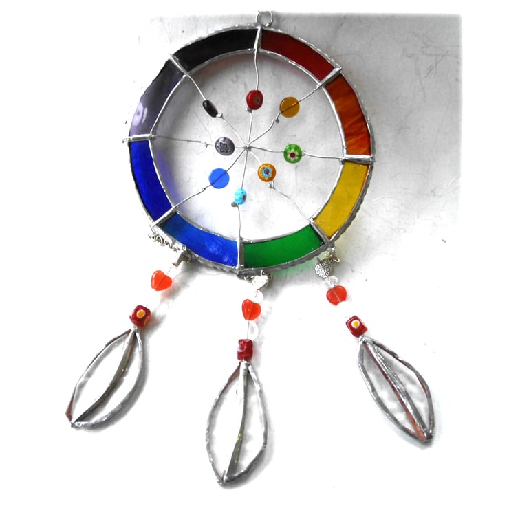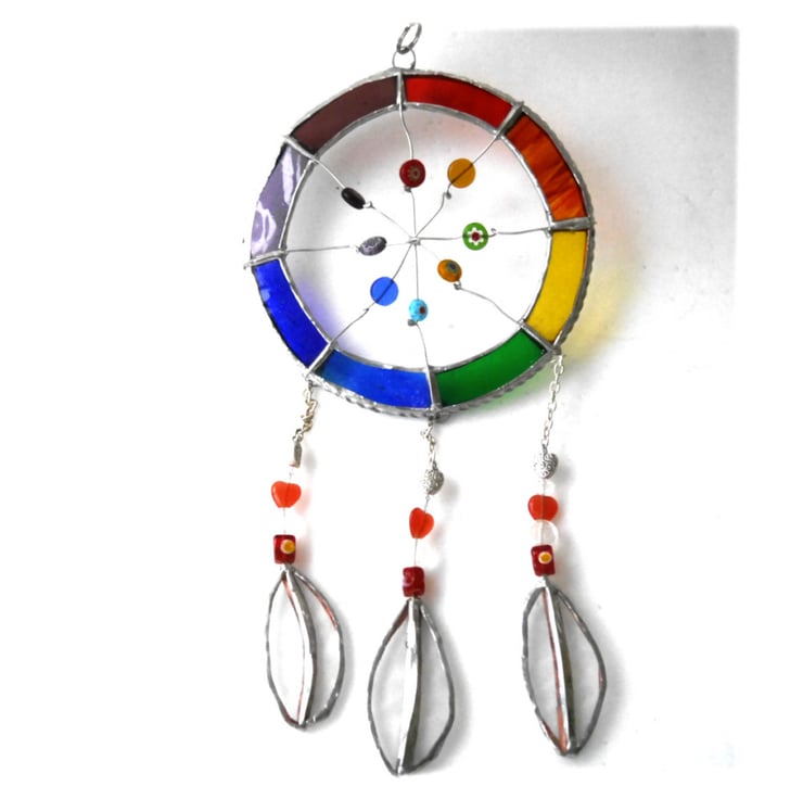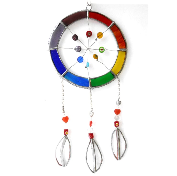 The hoop is made from glass, Rainbow shades and the net from wire on which I have threaded a mixxture of coloured glass beads.