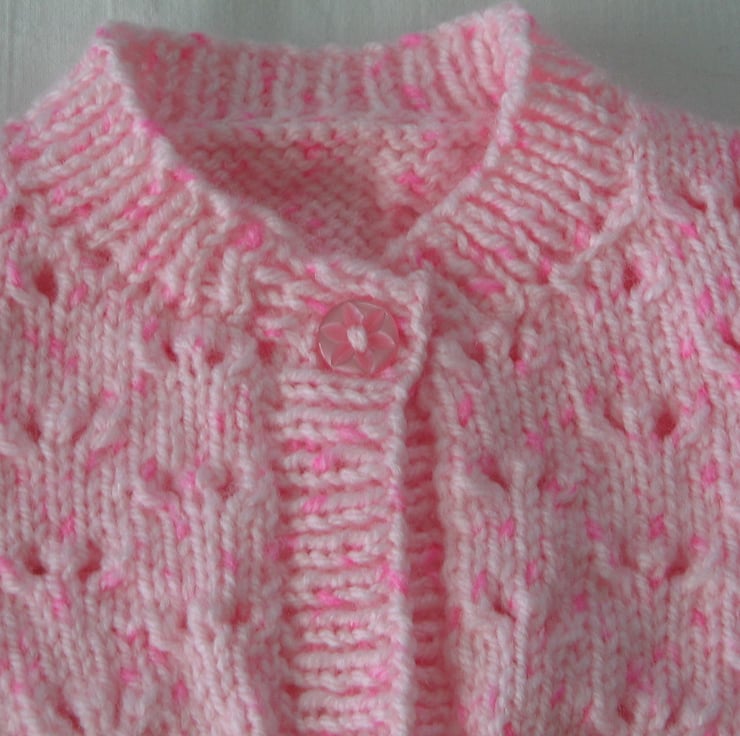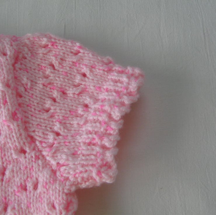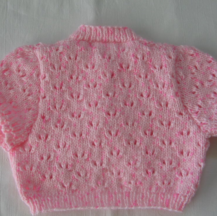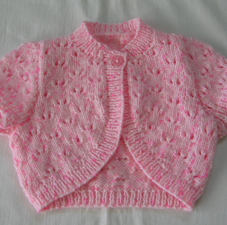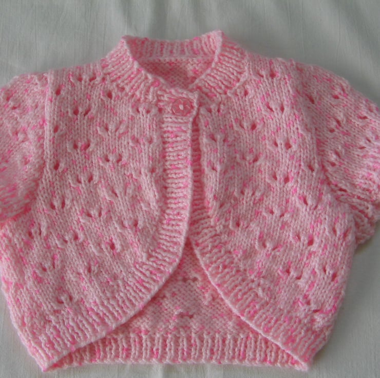 This is a hand knitted short sleeved bolero knitted in 100% acrylic double knit. It is in a pretty pink with brighter pink spot and will compliment any summer dress. It has an all over eyelet pattern and one button to fasten at neck Designed to fit over summer dresses in a bolero style with curved fronts. Very pretty!!!!!