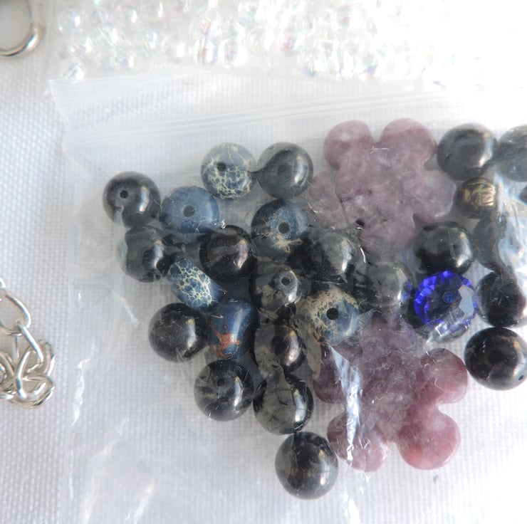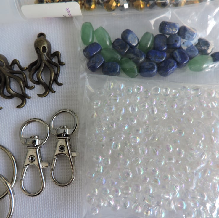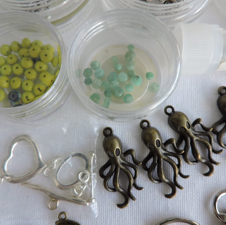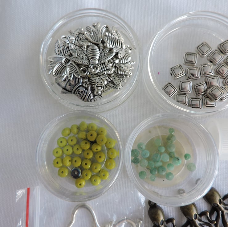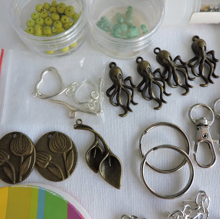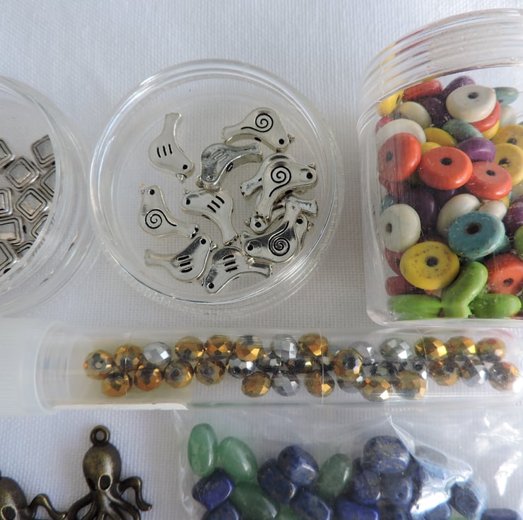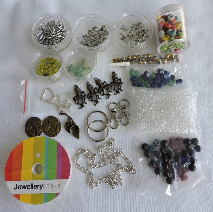 An assorted lot of jewellery making items. Beads include howlett donut beads in assorted colour, aurora borealis beads, a few jade ovals, lapis lazuli. Assorted silver plated and bronze charms, toggle clasps, and stretchy bead thread,