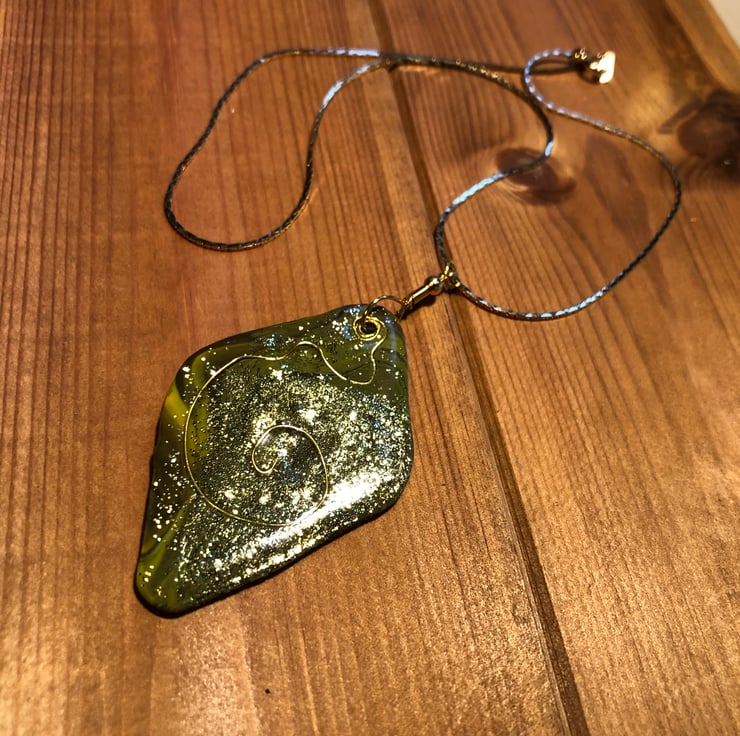 Polymer clay and resin pendant. The green of the forest with inclusions of glitter and wire, all encased in a layer of clear resin.