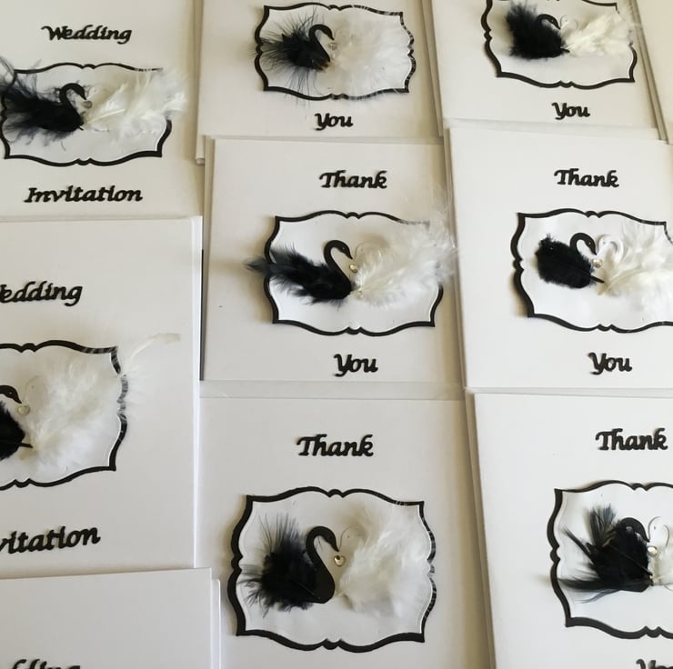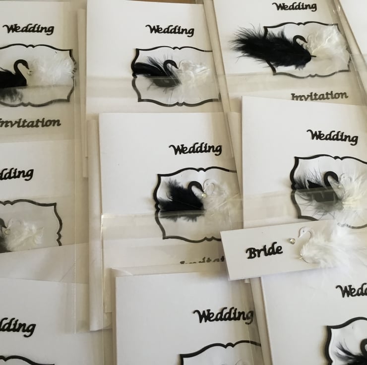 These lovely black and white swans, complete with feathers, make an unusual wedding invitation.