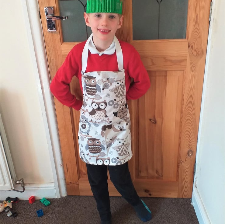 This is a gorgeous royal blue apron with brightly coloured dinosaurs dancing all over it. (They may not be in the same positions as in the illustration.) I have made it of a good quality machine washable cotton, with white acrylic webbing straps. It measures approximately 20" (50 cm.) from neck to hem, and 16" (41 cm.) at the widest point, and will fit a child from about 6-10 years. The boy wearing a different apron of the same size is seven years old.
