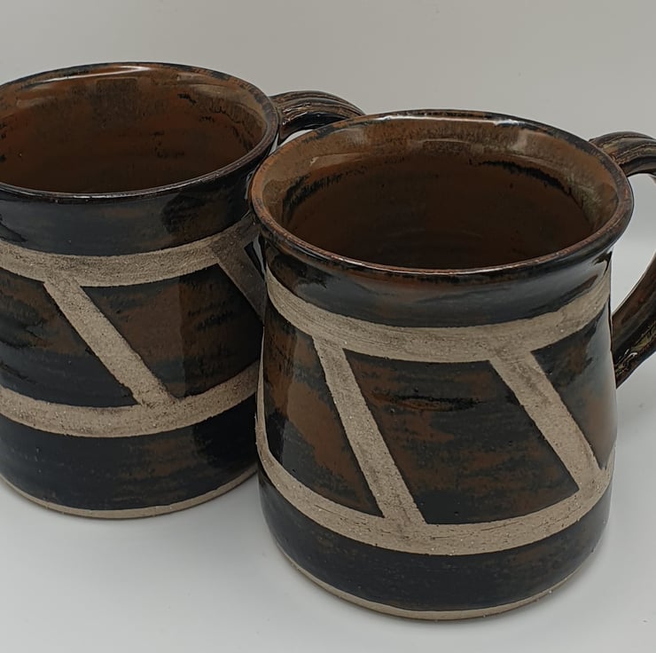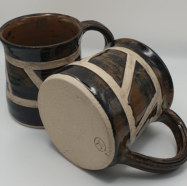 Stoneware mugs with taped resist on outside creating an interesting pattern and surface. The glaze is called River Rock and has wonderful variations in colour of browns.