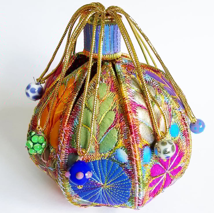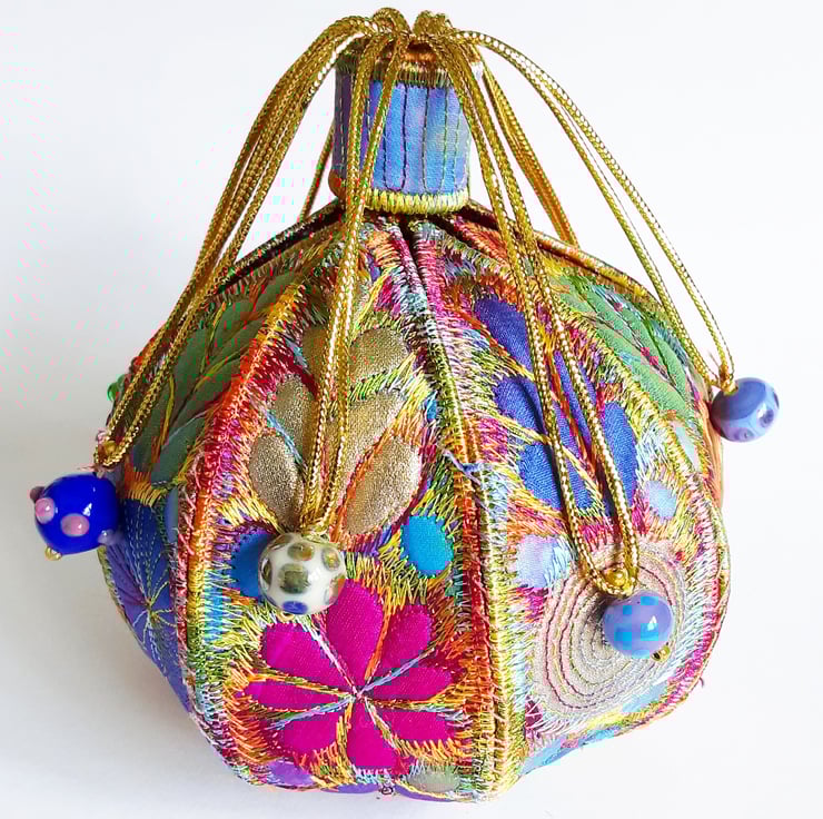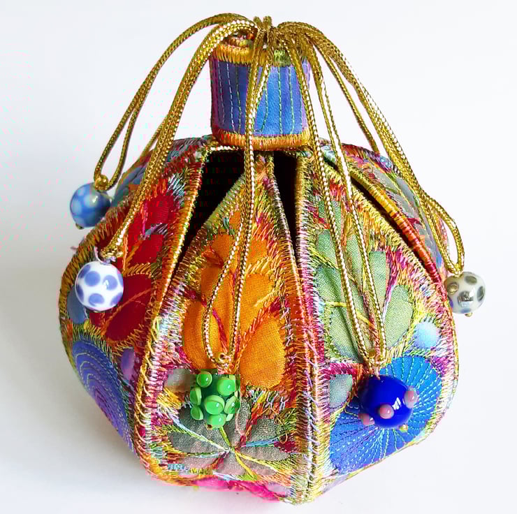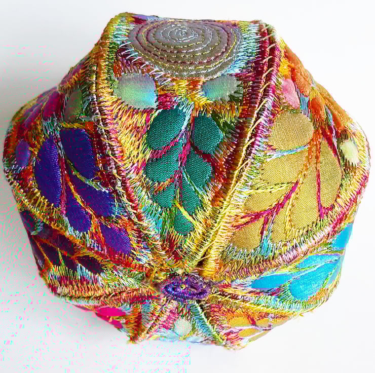Made from layers of fabric including hand dyed Egyptian cotton and silk fabrics using the free machine embroidery style of sewing and applique.