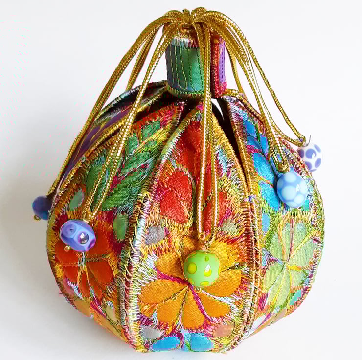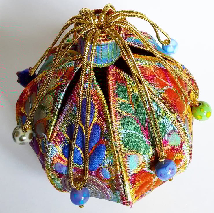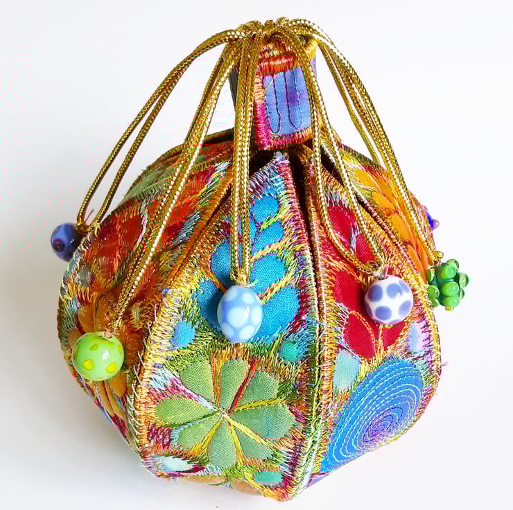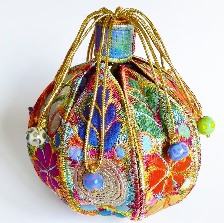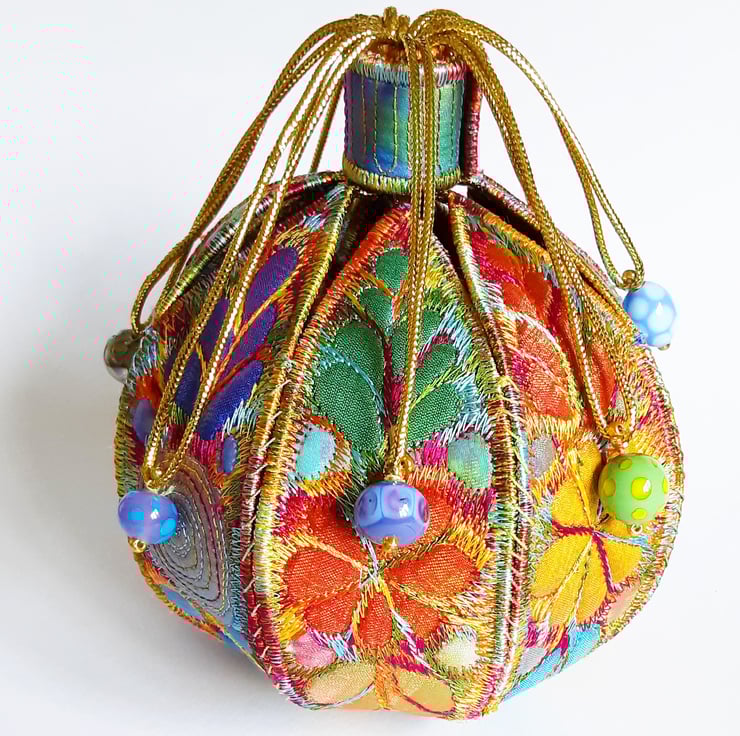 There is a coil of fabric to keep it closed and one of my own handmade glass beads hanging off the thread of each loop.
