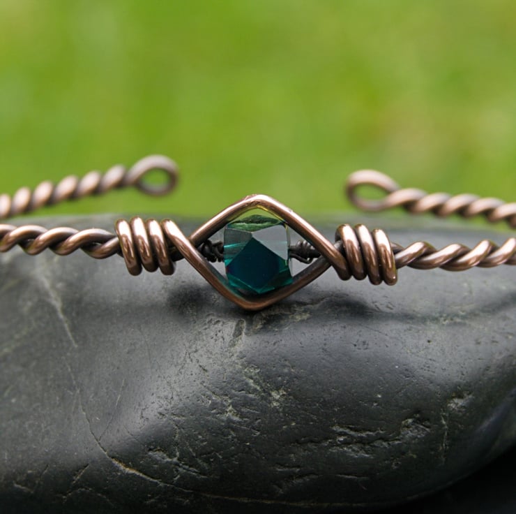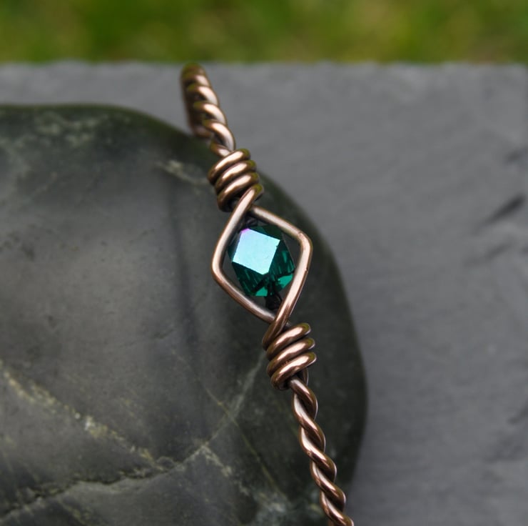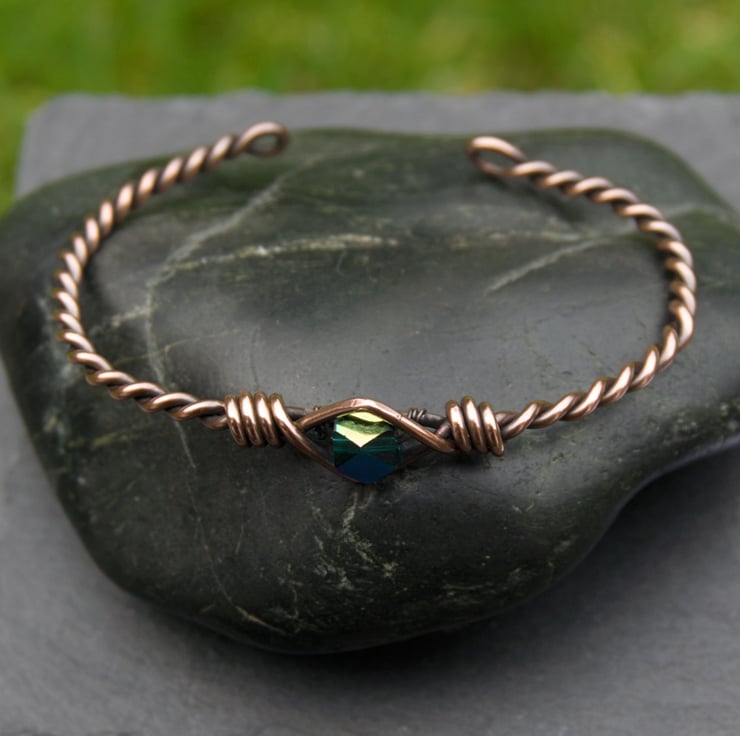 This pretty cuff is formed of twisted copper wire and features a cubed shaped glass bead, with a blue iridescent finish. The unusual bead is sitting in the centre of the cuff, framed by a diamond of bare wire to match the square on the top of the bead. The ends are small loops, so it's comfortable to put on and wear. The finished cuff has been oxidised and then polished to really highlight the twisted elements.