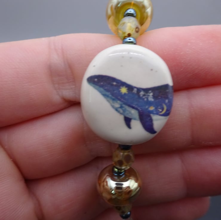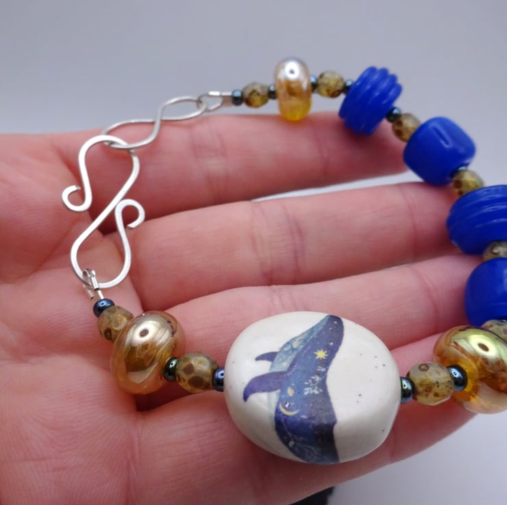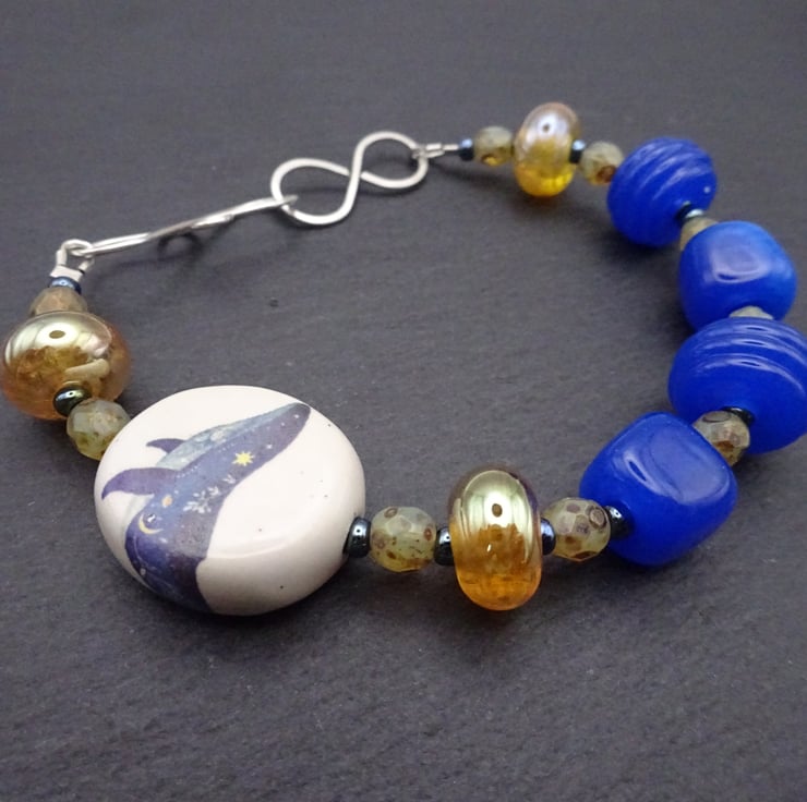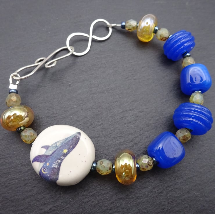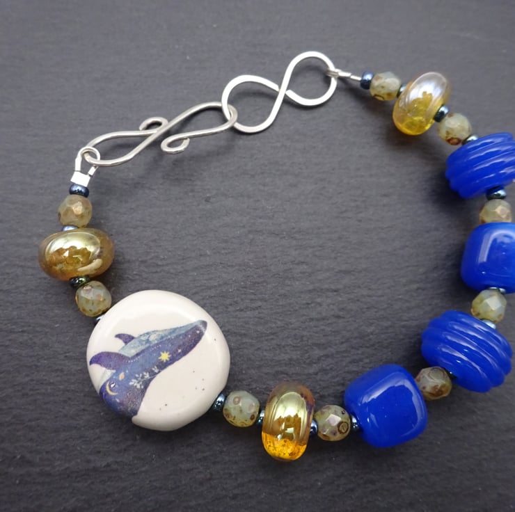 A bracelet made with handmade lampwork glass beads, Czech glass beads and a handmade ceramic blue whale bead. The bracelet fastens with a handmade sterling silver hook.