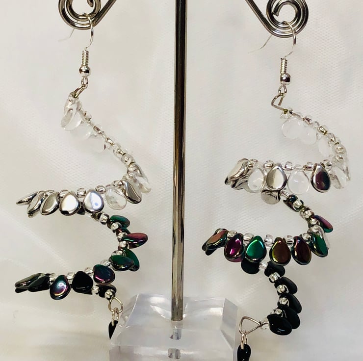 A spiral of memory wire with pip beads fading from black to clear.