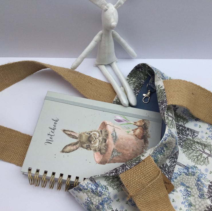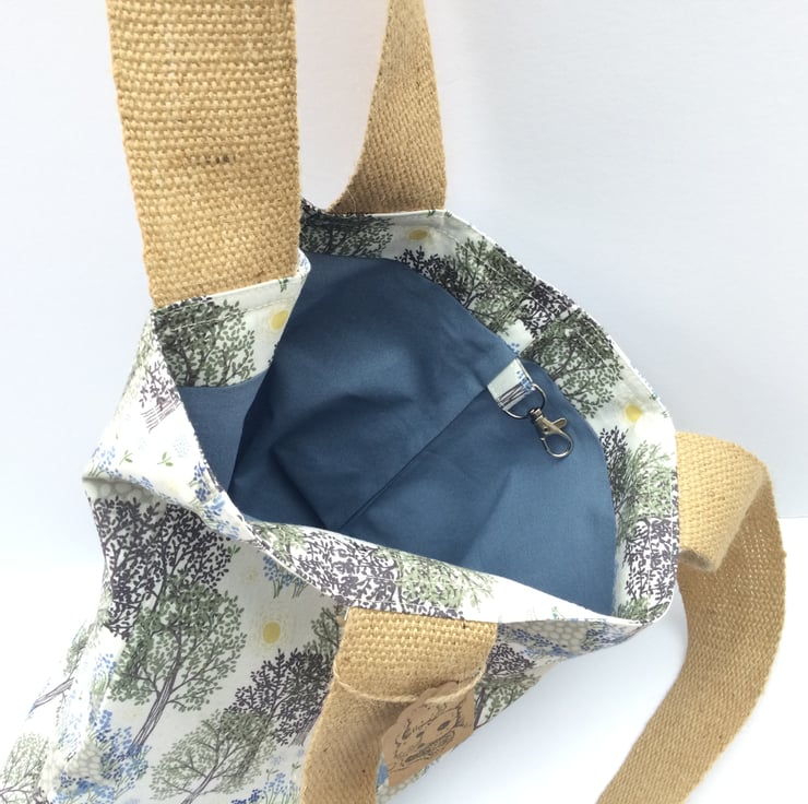 Gorgeous tote bag made from a lovely quality soft cotton. It has a beautiful tree print pattern with blue flowers below the trees and a cobbled path to the sunshine. Inside at the top has been faced with the same fabric and the lining is a mid blue. I have included a lobster clasp to the inside seam for clipping your keys or maybe have a look at my little pouches and key rings for sale in my shop.