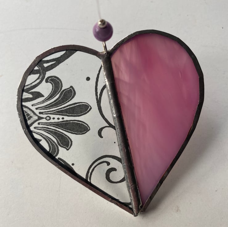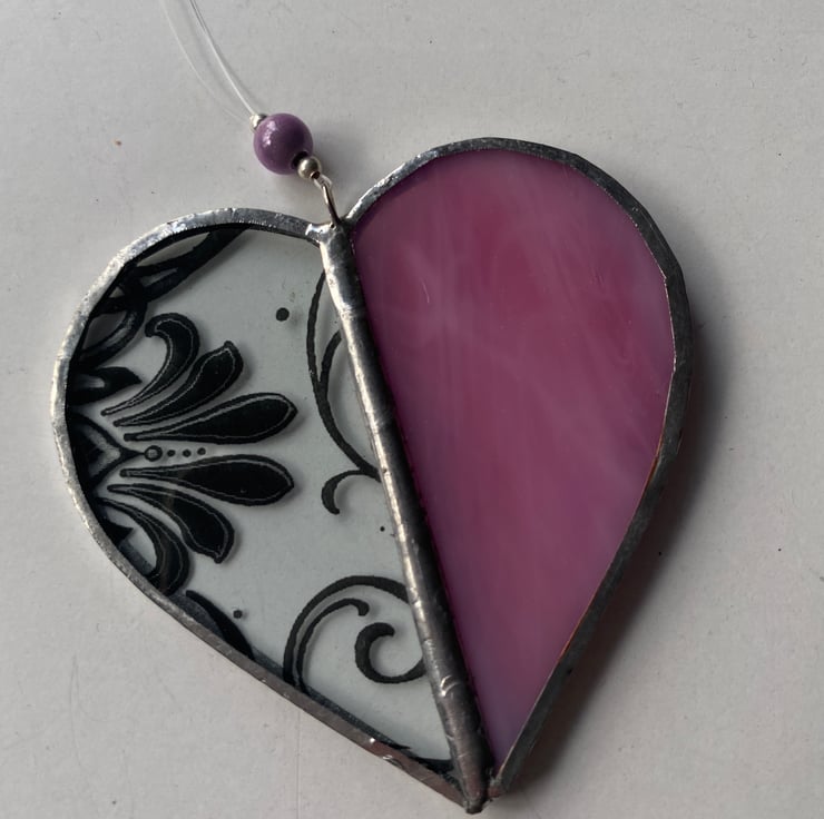 A beautiful 2 tone stained glass heart made using the Tiffany ( copper foiled ) method of stained glass . Each half is a different colour glass ( pink , black/ clear )