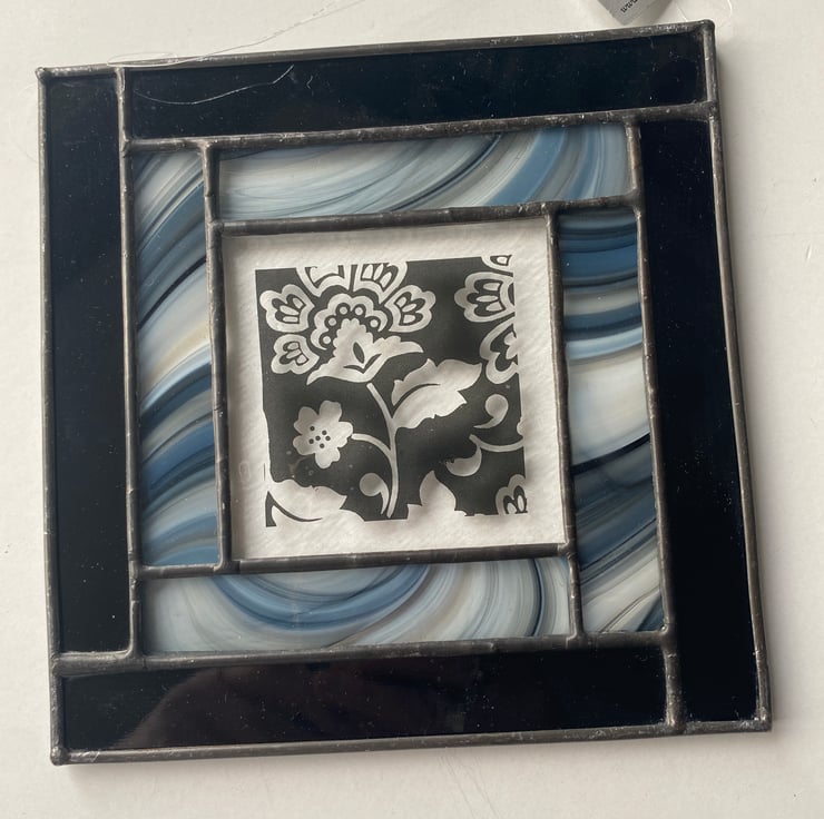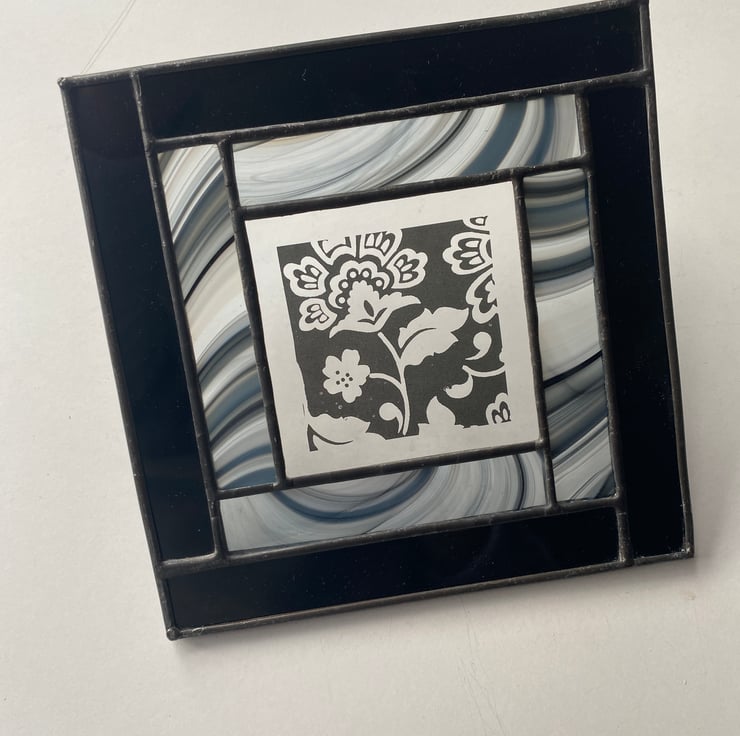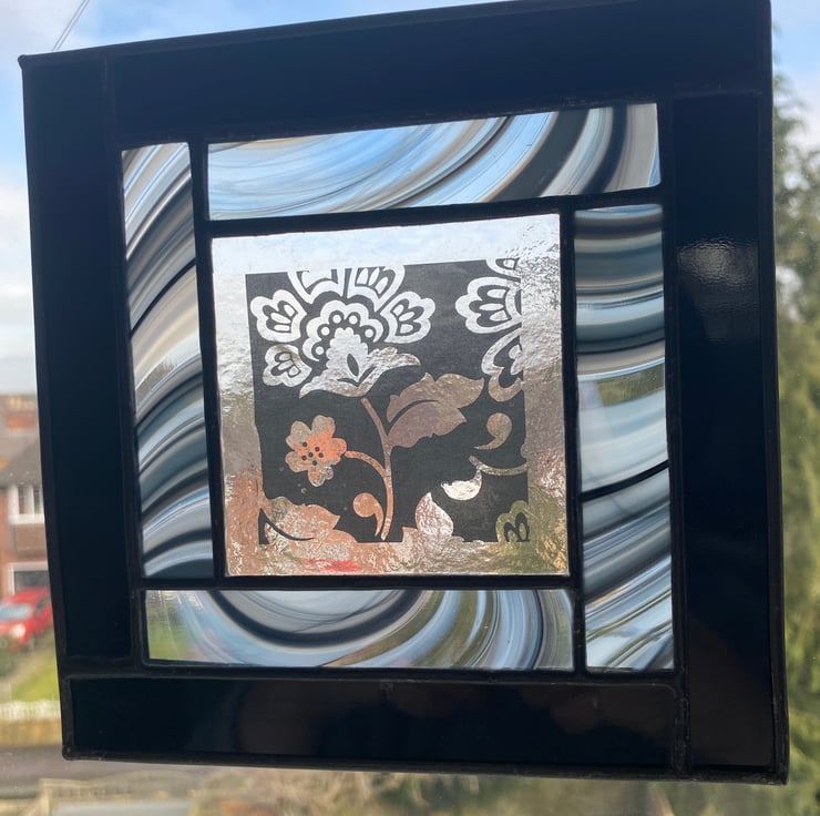 A beautiful panel made using the Tiffany (copper foiled) method of stained glass. The panel is comprised of 4 black strips, 4 black and clear swirly strips with a central black flowery decal panel .The lead came edge has been patinated to give a black antique finish, and it has a clear nylon hanging thread.