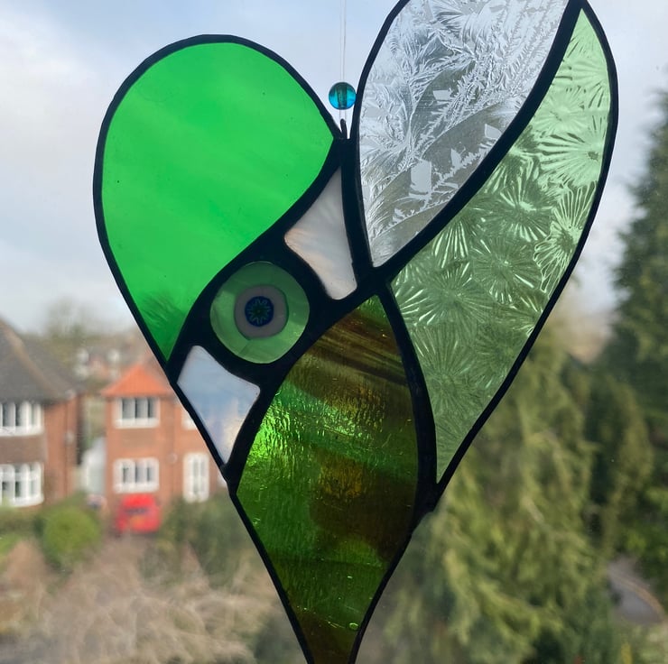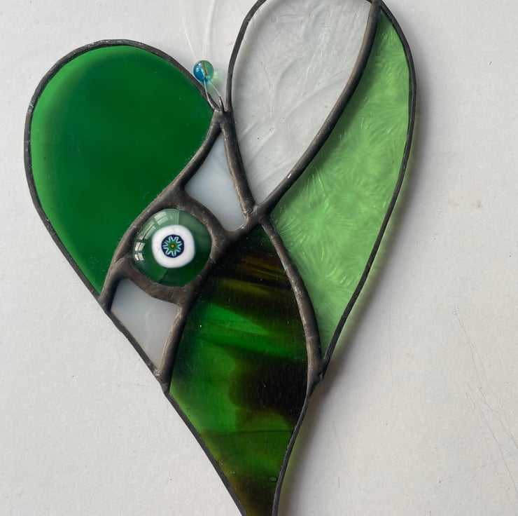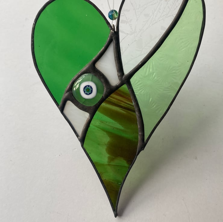 A beautiful 6 piece glass heart made using the Tiffany (copper foiled) method of stained glass. The heart is comprised of a selection of green coloured glass and incorporates a decorative glass nugget . The solder is patinated to create a black finish, and the clear nylon hanging thread is complete with a small bead at it's base.