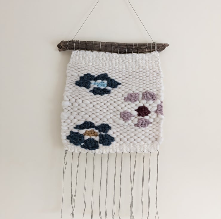 Individually designed and handmade wall hanging. Woven using beautiful materials, including natural wool fibres and pure cotton cords. Hung on a piece of driftwood.