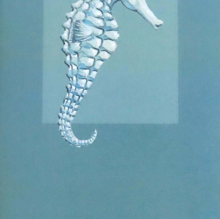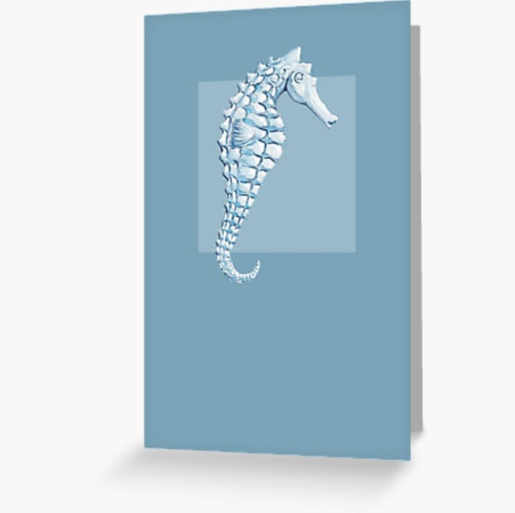 Seahorse design on mid blue ground artist card.