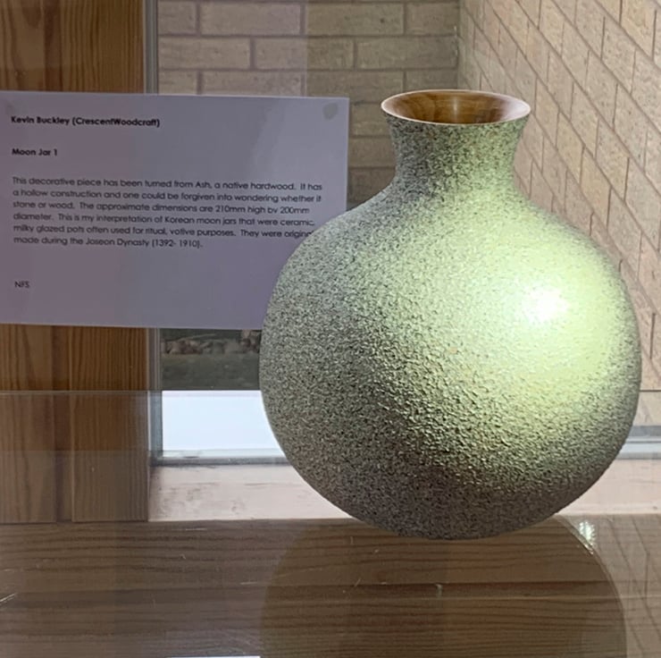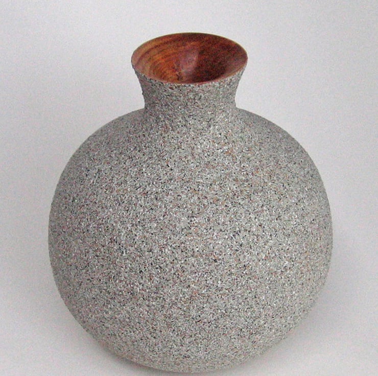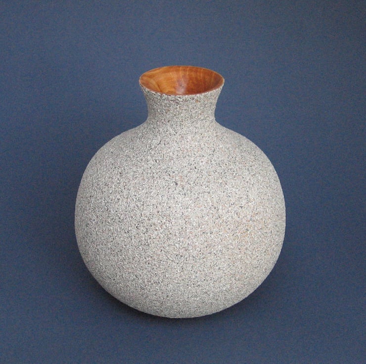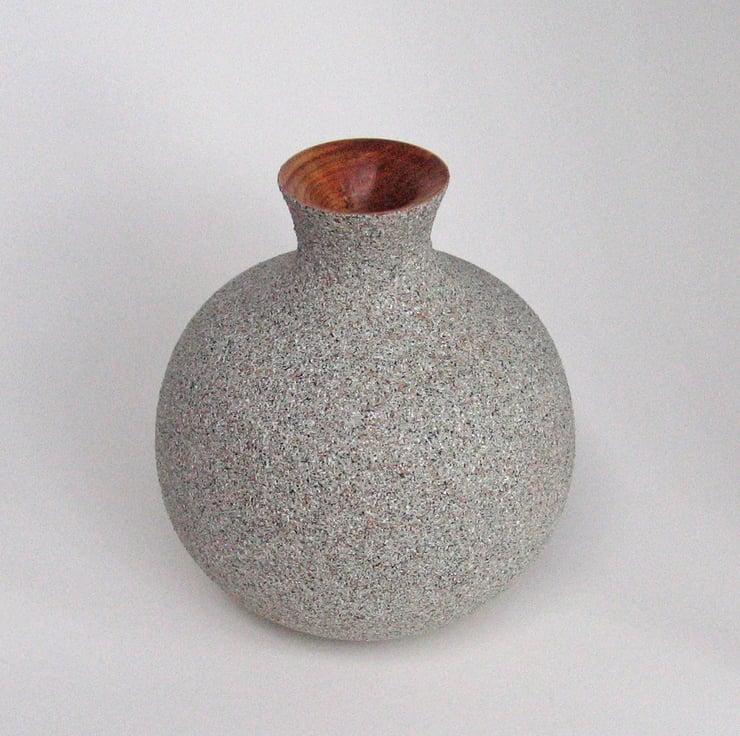 A decorative jar turned in Ash, a native hardwood. It has a hollow construction and one could be forgiven into wondering whether it is stone or wood. The finish is simulated stone that has then been given a matt lacquer to improve durability.