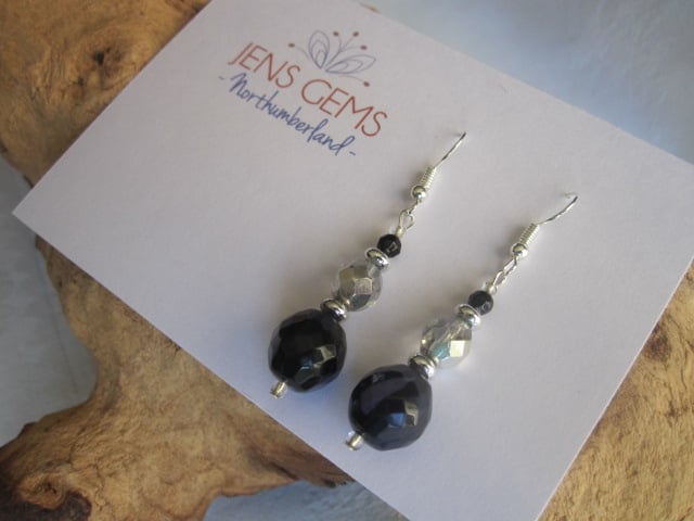 A pair of light weight earrings made using acrylic and glass round faceted beads. The beads are either deep/dark purple or silver in colour with silver lined clear seed beads in between. They have a drop of approx. 3.8cm from the base of the ear wire and are approx. 1cm wide. The ear wires are silver plated but can be changed to sterling silver at check out.