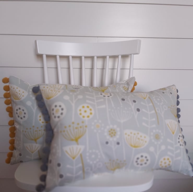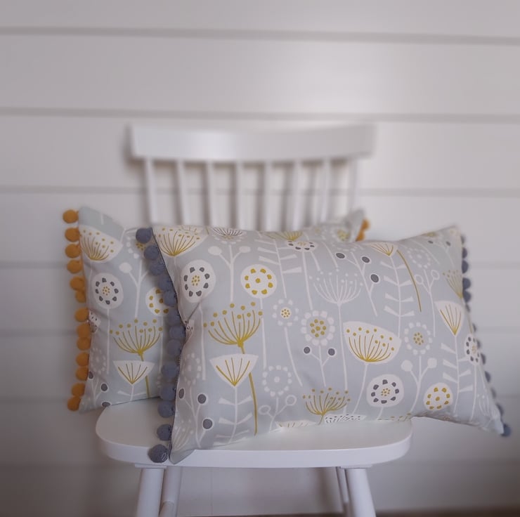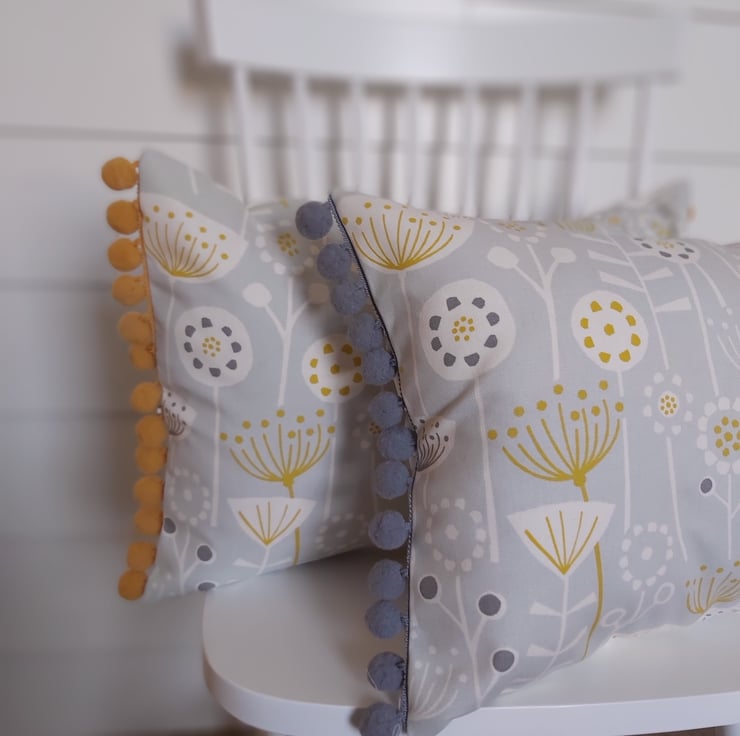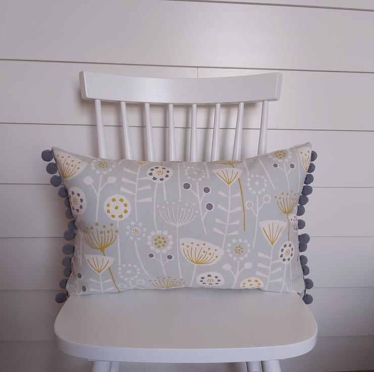 Grey and mustard seedhead cushion cover with mustard pom poms with cream back and central zip