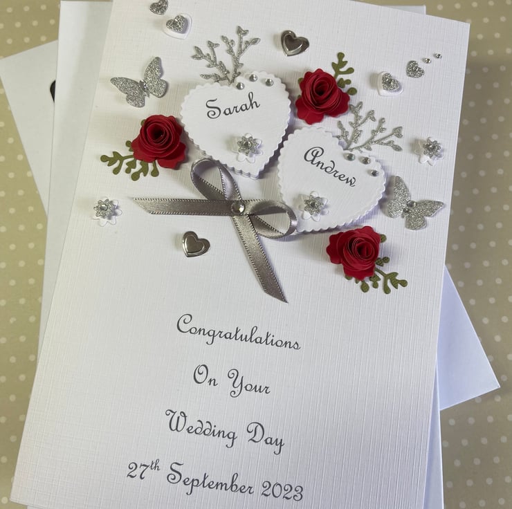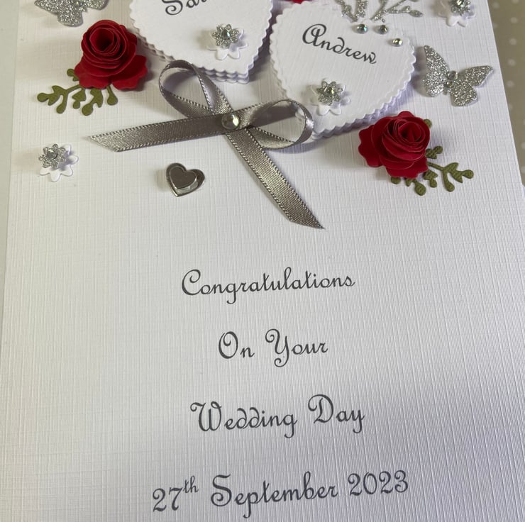This handmade card is A5 in size (210mm x 150mm) on 300gsm heavyweight linen cardstock and can be for a wedding, engagement, anniversary or any other special occasion for a couple. This red, white and silver hearts card is decorated with ribbons and gems. I make each card to order and they can be personalised inside as well as on the front of the card.
