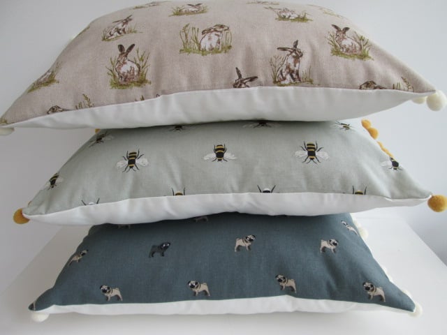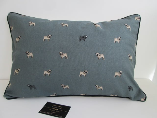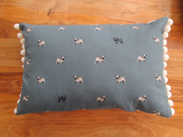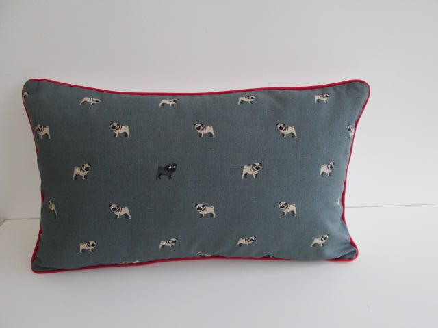 Sophie Allport pugs fabric cushion cover with cream back and central zip and red piping