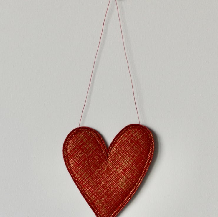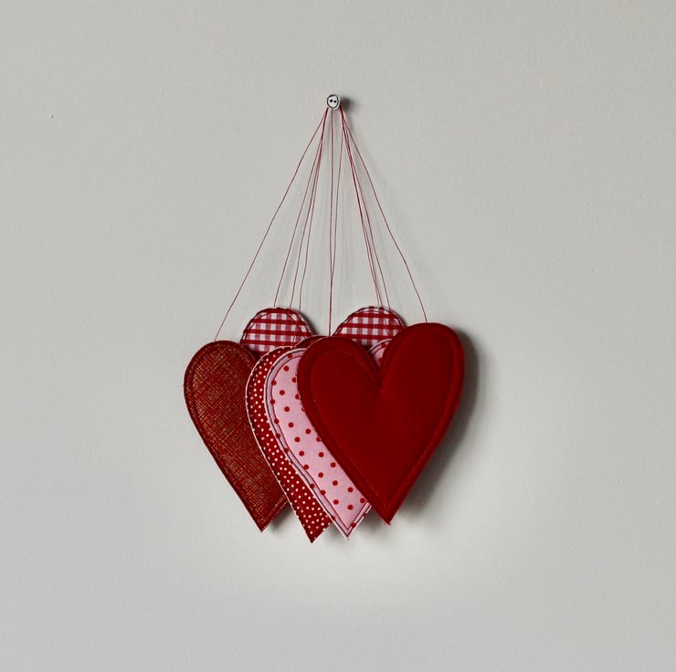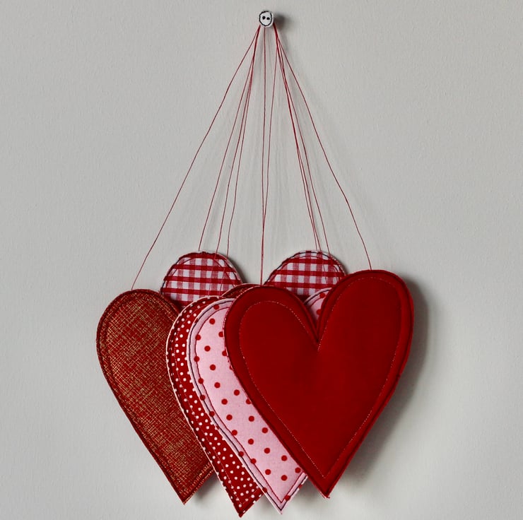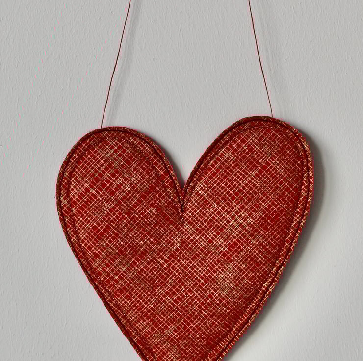 Each heart is sewn using 100% wool felt, cotton cloth and free hand machine embroidery; multiple layers of cloth are sewn together and cut out by hand using very sharp scissors. With a linen string to suspend.