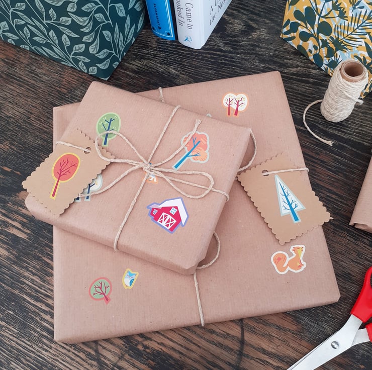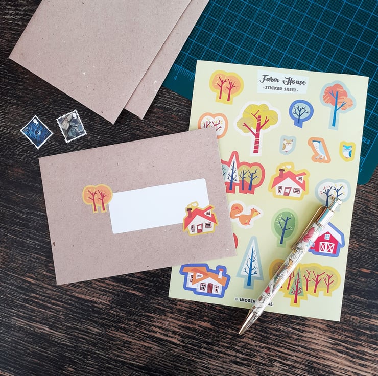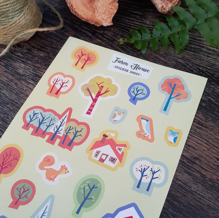 A mid 20th century inspired illustrated sticker sheet featuring farmhouses, and woodland creatures! This is an A5 paper sticker sheet, featuring 19 stickers. Great for use in scrapbooking, journaling, and decorating snail mail. They will add a personal touch to gift giving when combined with brown paper wrap!