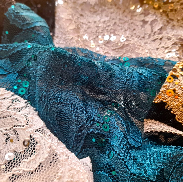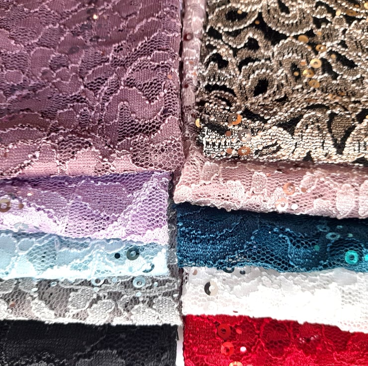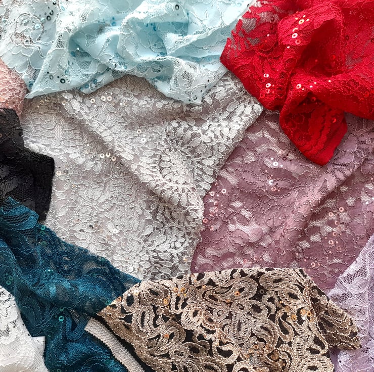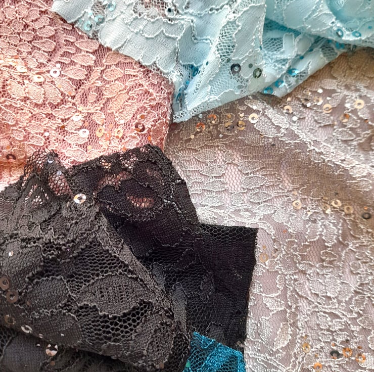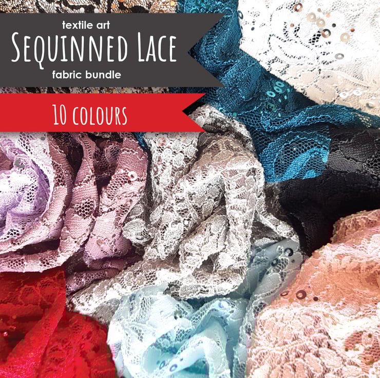 A wonderful selection of 10 pieces of beautiful sequinned stretch lace fabric. This bundle will be great for slow stitch projects, most crafts, card making, junk journaling or simply to boost your craft stash.