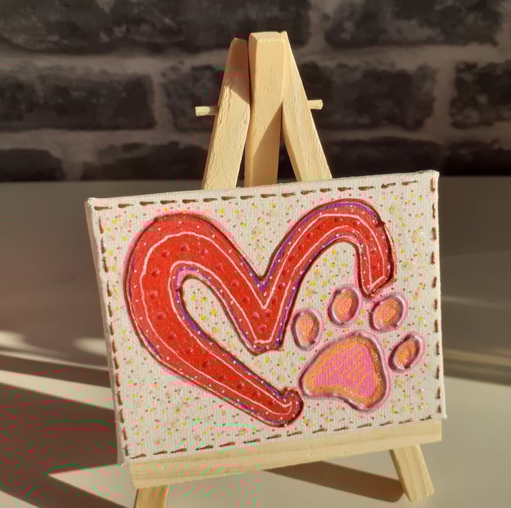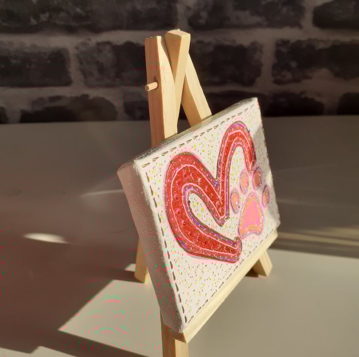 This is a fun mini canvas decorated with a heart and a paw - for all the Fur Mums and Fur Dads out there who love their pets. For your desk at work or your shelf at home this bright little painting will brighten up any space. Comes with its own natural wood easel but could just as easily be displayed on a wall next to that photo of your Fur Baby.