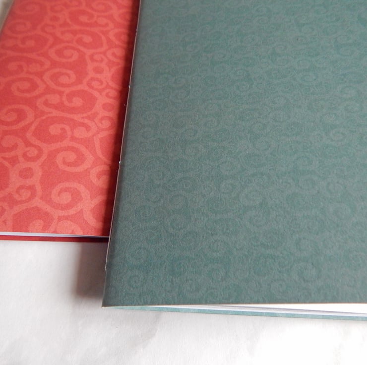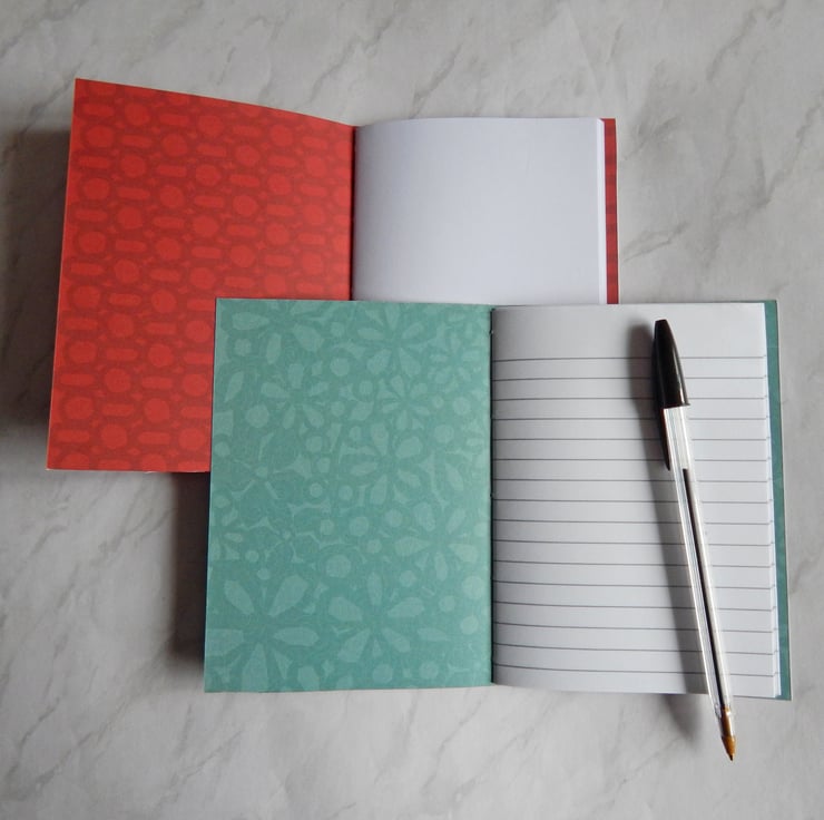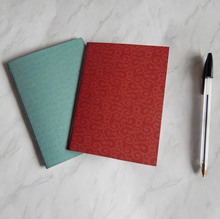 A pair of A6 pocket notebooks with covers of stiff paper, printed with designs on both sides.