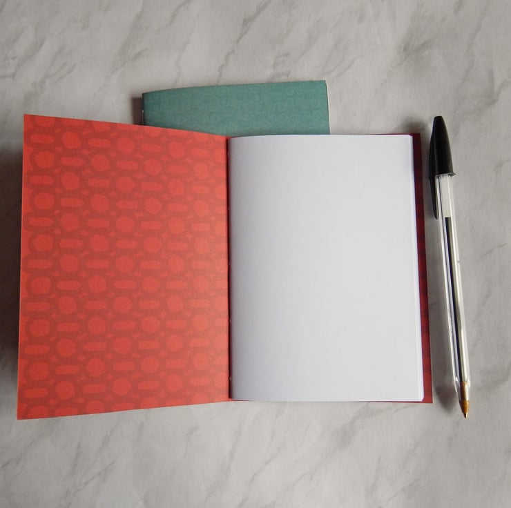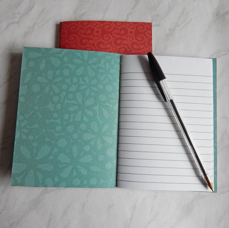 A pair of A6 pocket notebooks with stiff card covers in turquoise and red, filled with white paper.