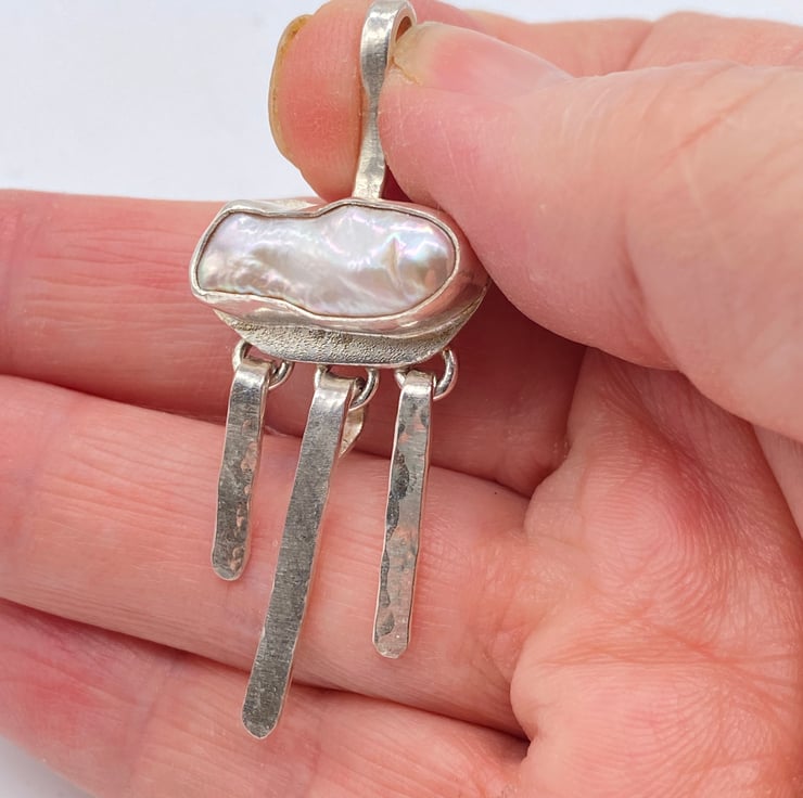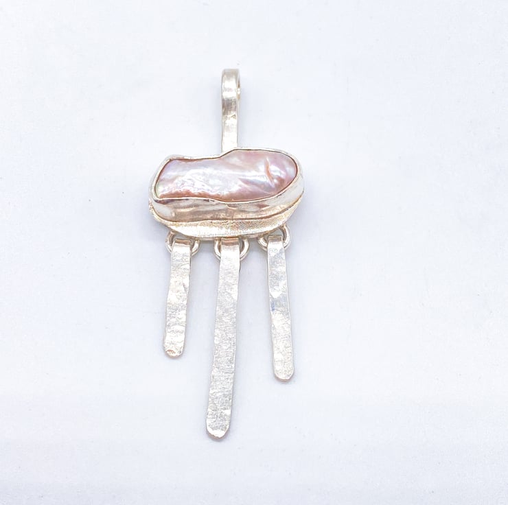 A Biwa pearl has been wrapped into fine silver and placed onto a sterling silver backplate. At the bottom of the pendant it has three sterling silver dangles which give movement to the pendant.
