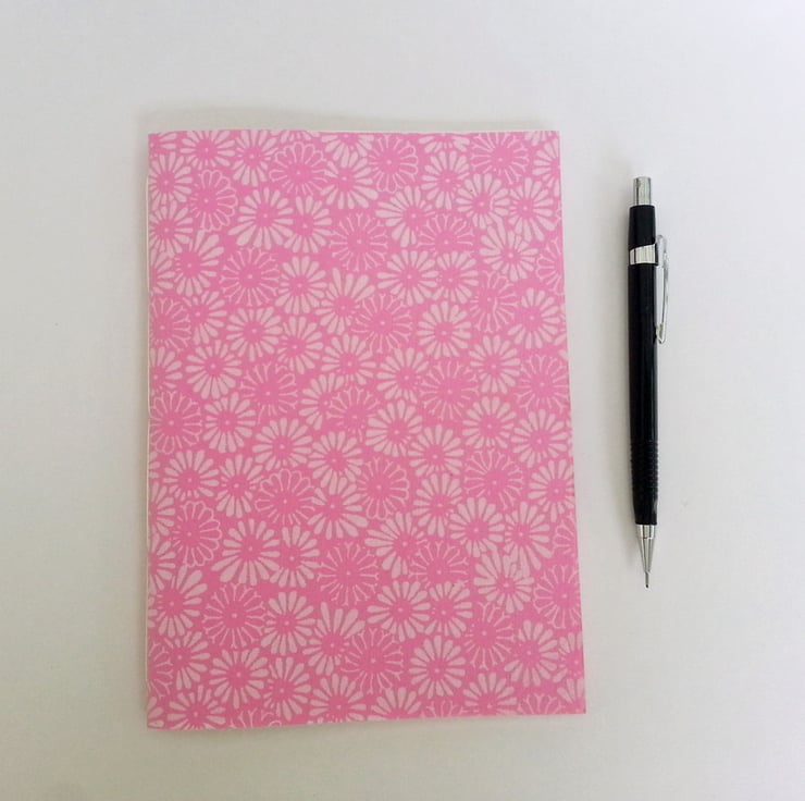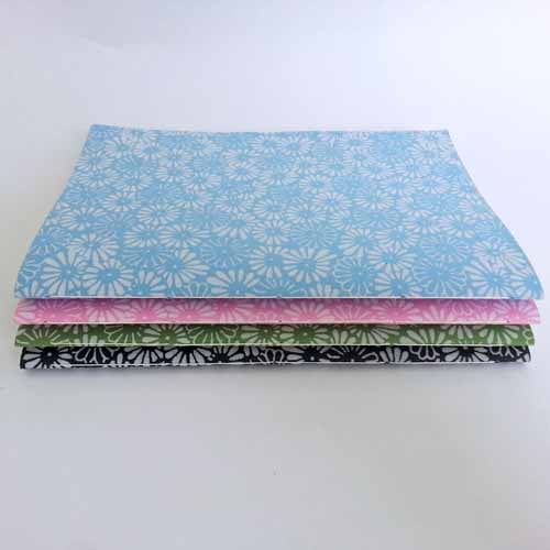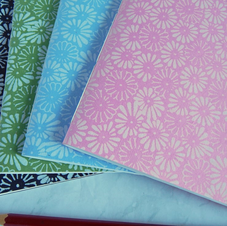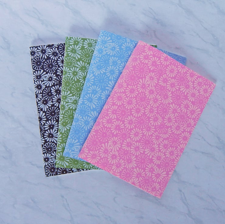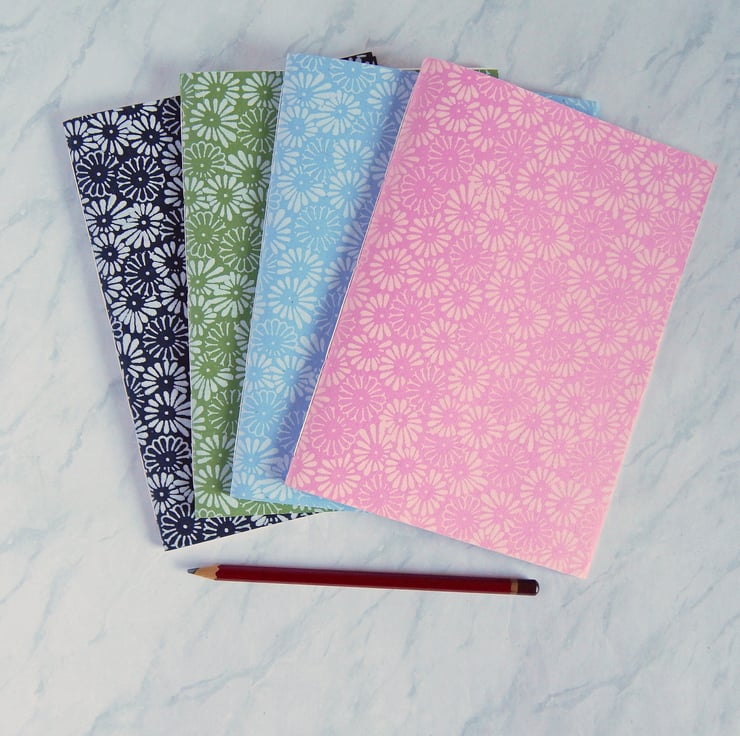 Four A5 Pamphlet style notebooks or sketchbooks with Indian paper covers, printed with daisies.
