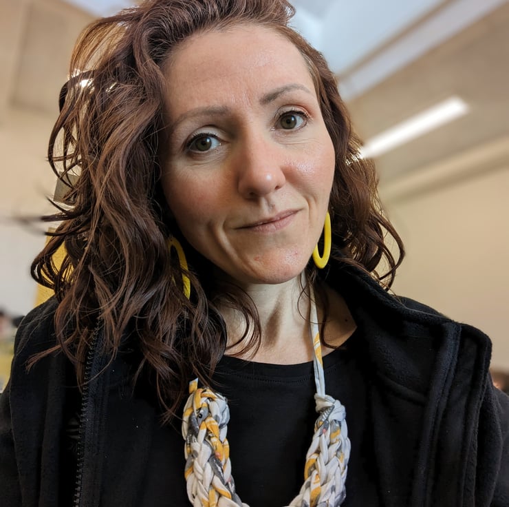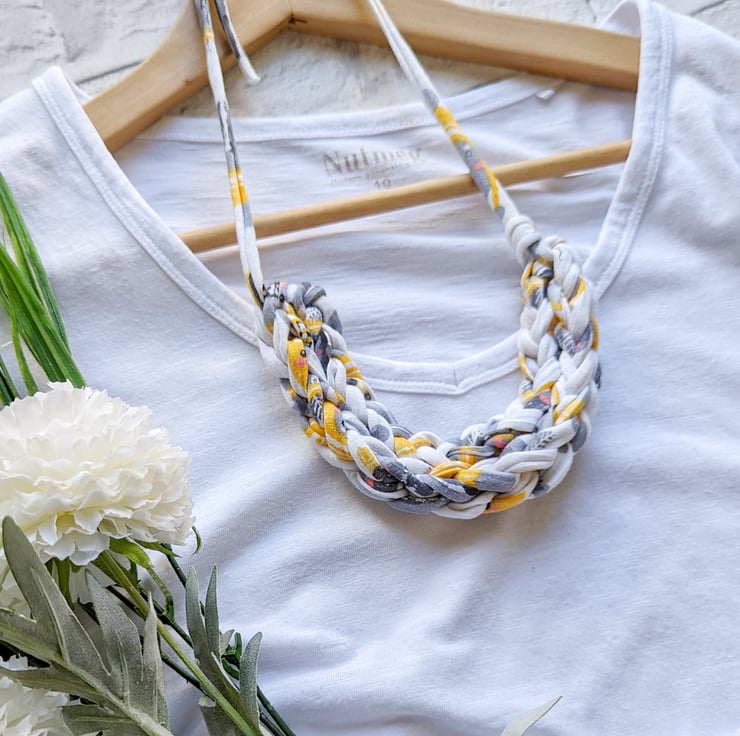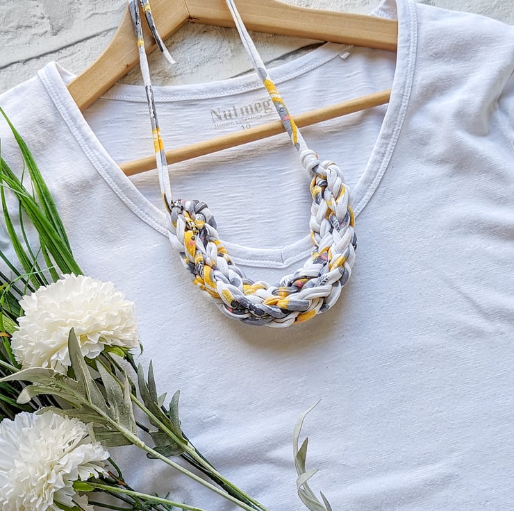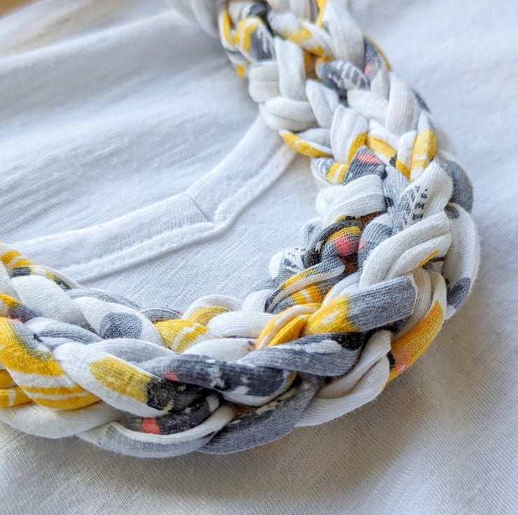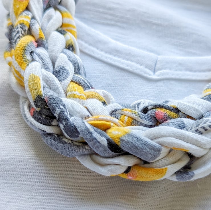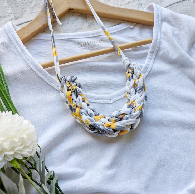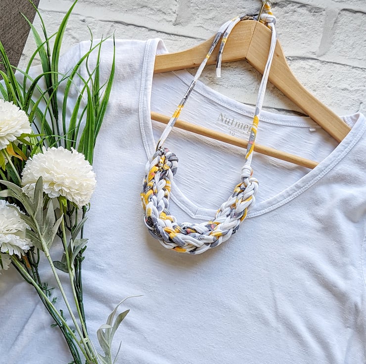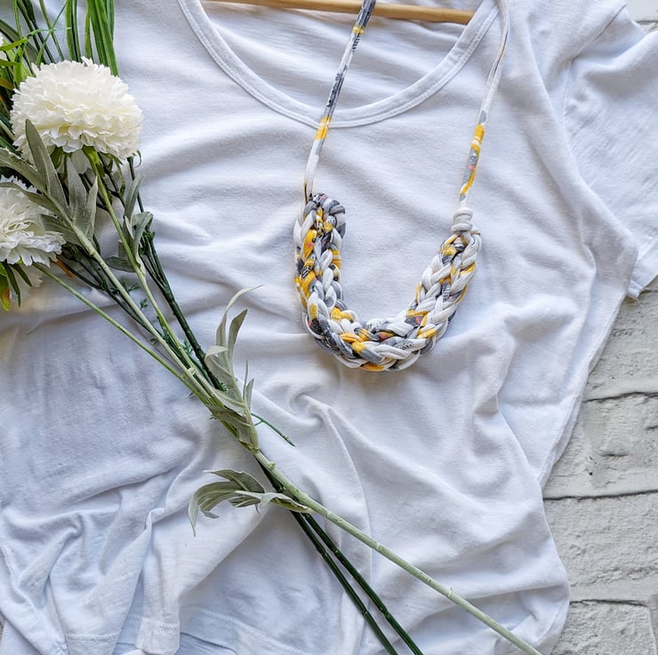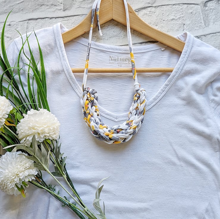 Yellow Grey and Graphite Coloured Hand Woven T Shirt Yarn Necklace