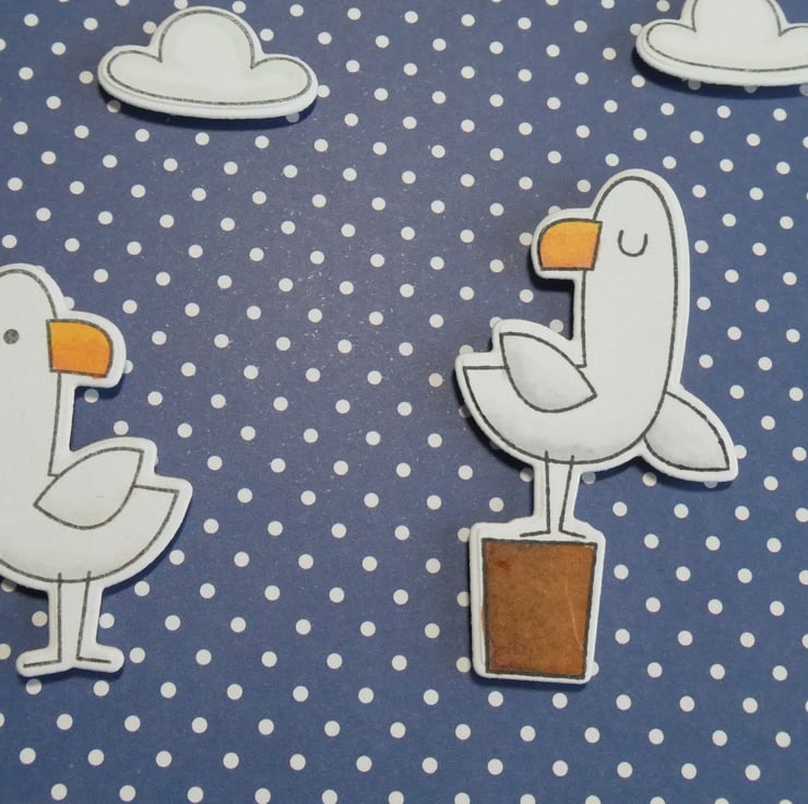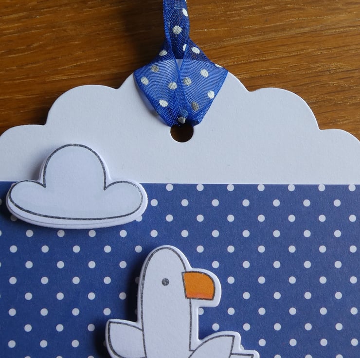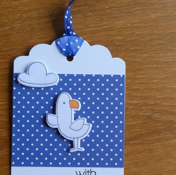 The matching gift tag is rectangular with a scalloped top edge and measures 8 x 12.5cm excluding ribbon. It has hand stamped and coloured images of a matching gull and cloud on a navy and white polka dot band of card with the message 'With Love x' stamped in black archival ink in the bottom corner. It has been finished with a navy and white polka dot ribbon.